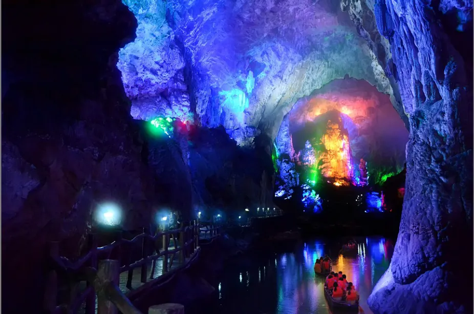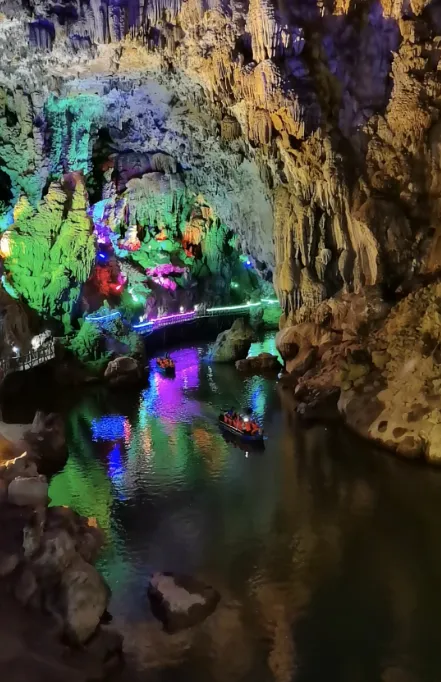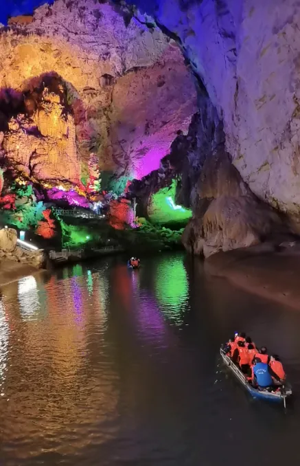 平果通天地下河景区素有“中国最美地下暗河”之称,全长1.6公里的地下河蜿蜒曲折,钟乳石千姿百态,岩壁上的“生长纹”宛如地球年轮,河床散落的罕见“穴珠”更是大自然的馈赠。景区将杀猪宴活动与核心景观游览有机结合,推出“溶洞探秘+杀猪宴品鉴”精品线路,游客乘船游览暗河奇观后,即刻转入烟火气十足的宴席现场,实现“刚赏过亿年溶洞,又品地道农家味”的独特体验。