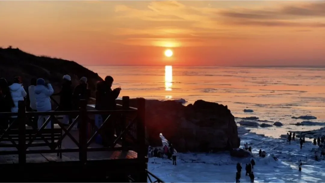 傍晚时分,来到山海广场,这里是观赏夕阳坠海的绝佳地点。冬日的海面格外宁静,当夕阳西下,整个海面都被染成了金黄色,海上的冰凌在夕阳的映照下闪闪发光,这一刻的浪漫与宁静,将成为您旅途中最难忘的记忆。