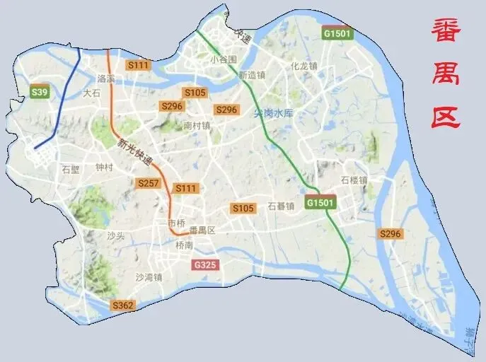 番禺区辖11个街道、5个镇,分别为:市桥街道、沙头街道、东环街道、桥南街道、小谷围街道、大石街道、洛浦街道、石壁街道、钟村街道、大龙街道、沙湾街道,南村镇、新造镇、化龙镇、石楼镇、石碁镇。区政府驻市桥街道。