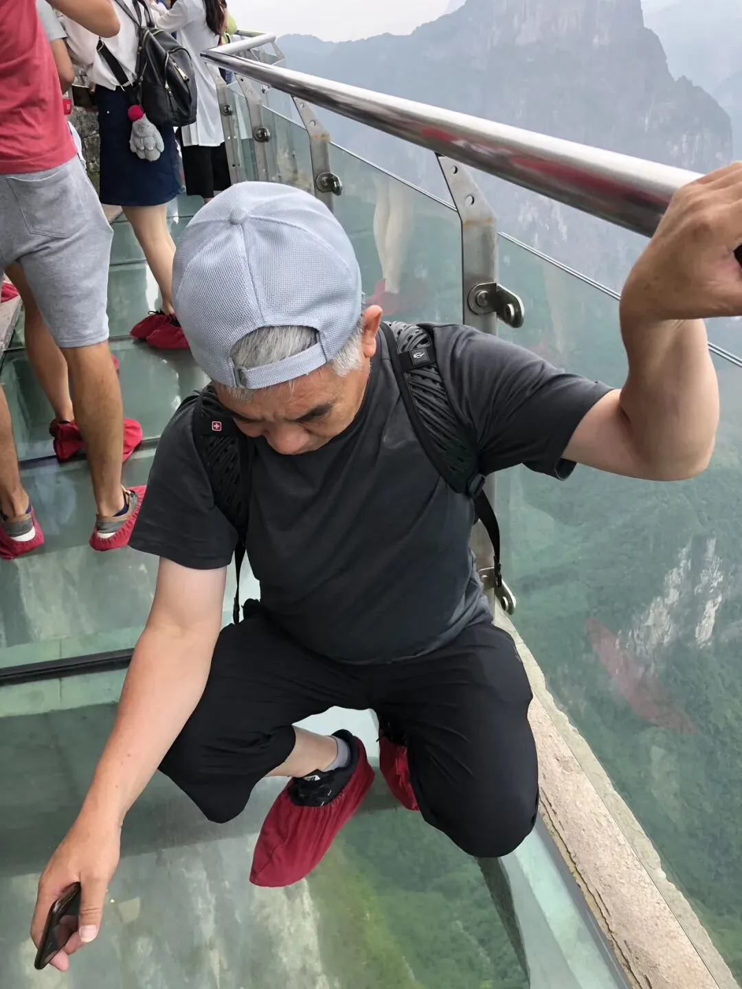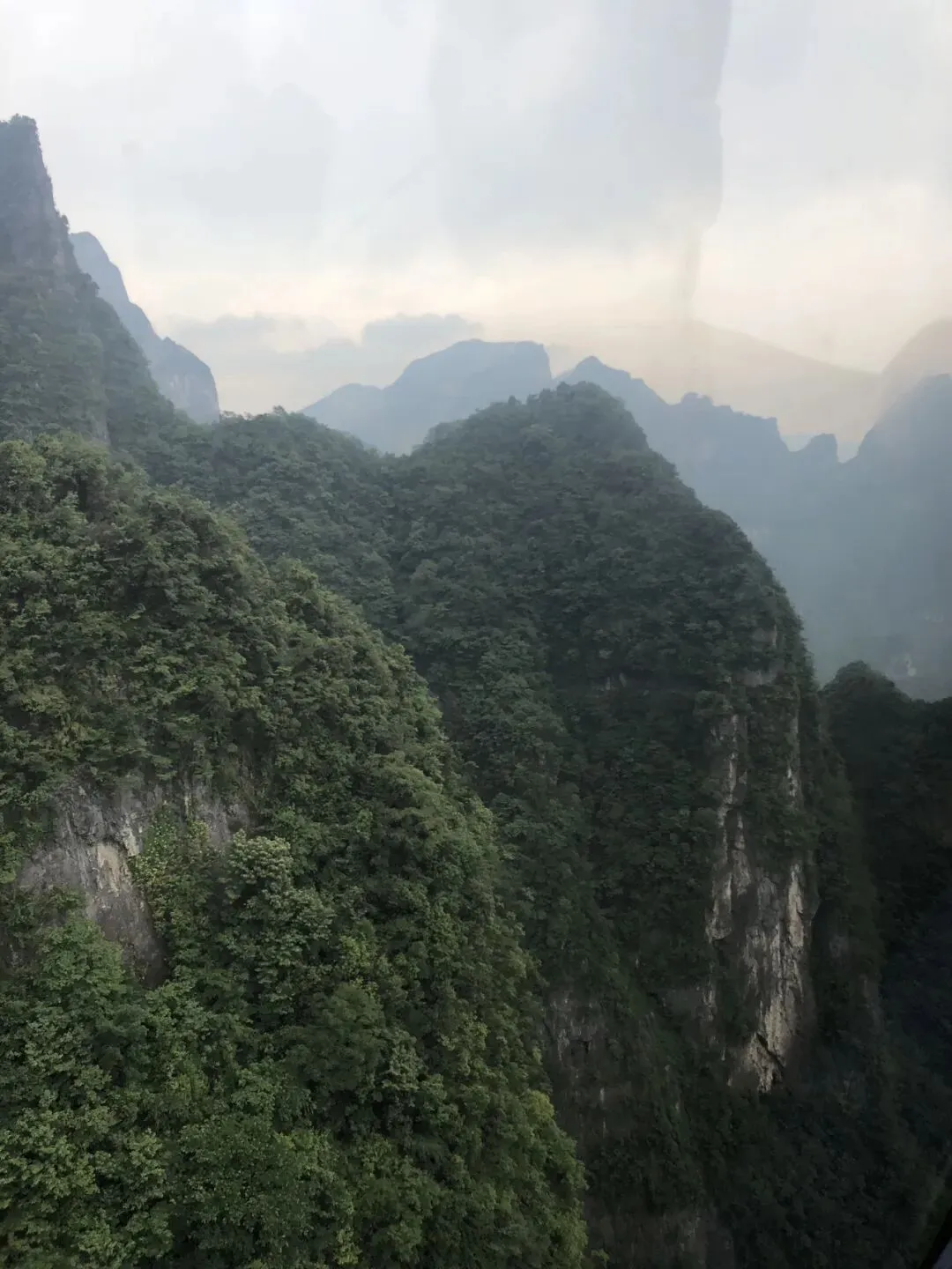登天门山,我们是坐索道直达山顶观景平台。天门山索道全长7454米,高差1277米,是国内局部斜度最大、支架最多的索道之一,全程需要二十八分钟。据说索道的行程有季节性变化,有时不能直达山顶 ,需在中转站转乘景区环保车或穿山扶梯上山顶。下山我们是坐穿山扶梯和景区环保车。不得不说,湖南省的旅游开发特别用心,景区设施特别完善,对老年人群和儿童特别友好。