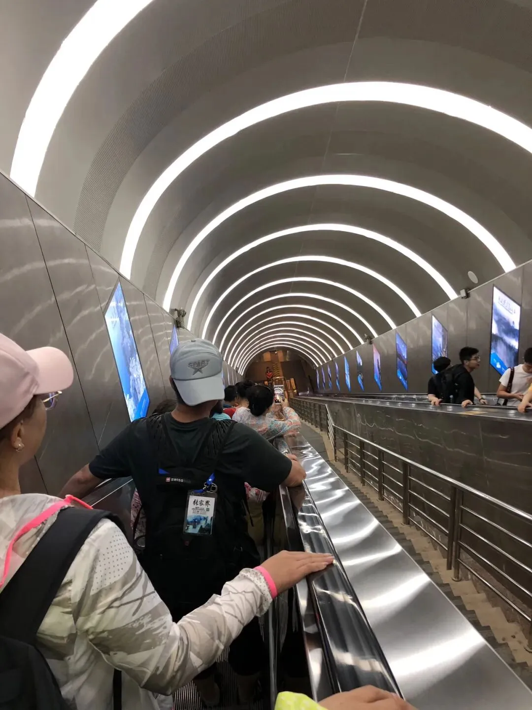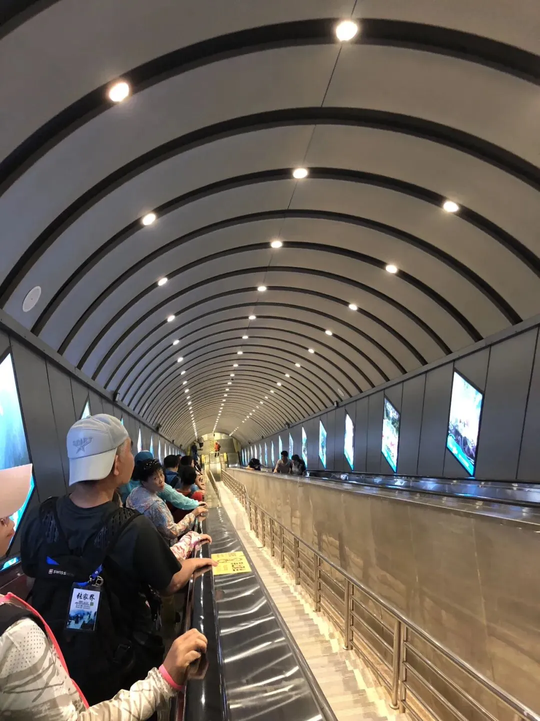 游览完毕上顶 ,我们乘穿山扶梯下山。天门山的穿山扶梯,2015年4月投入使用,运行长度897米,提升高度340米,从天门洞底直达山顶,共12段 ,运行跨度692米。有16台30米超大高度重载公交型自动扶梯、3台20米大高度重载公交型自动扶梯,单向每小时输送能力3600人。该工程成功完成了世界上环境最恶劣、工程最艰巨、施工难度最大、总提升高度最高、梯级运行总长度最长、最具创意的山体隧道中运行的自动扶梯工程 ,创造了数个世界之最,成为全球电梯界的经典项目。