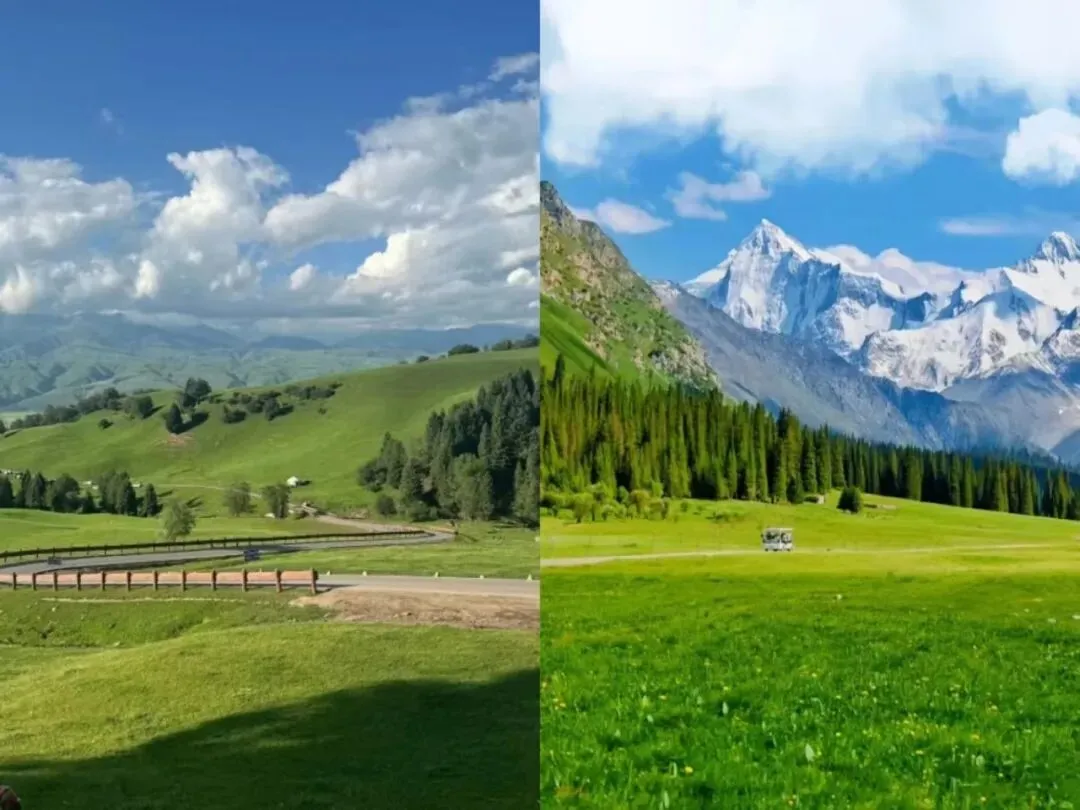 8月-9月,沃尔塔交塔夏牧场山花烂漫,呈现出春天的生机,而阿依达尔勒又是绿草如茵,一派夏季的景象。