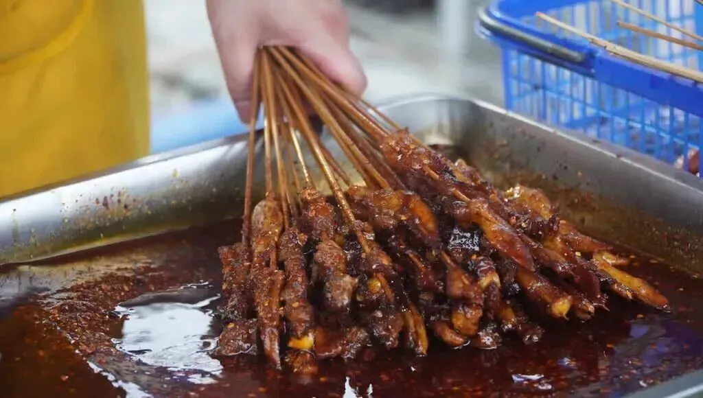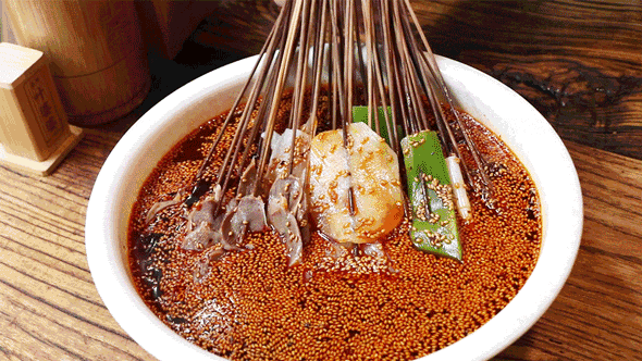 吸饱了红亮的汤汁,顺着鸡块缓缓滑落,芝麻的醇香混合着鸡肉的辣味在舌间泛滥,荤素搭配让人忍不住一串接着一串。