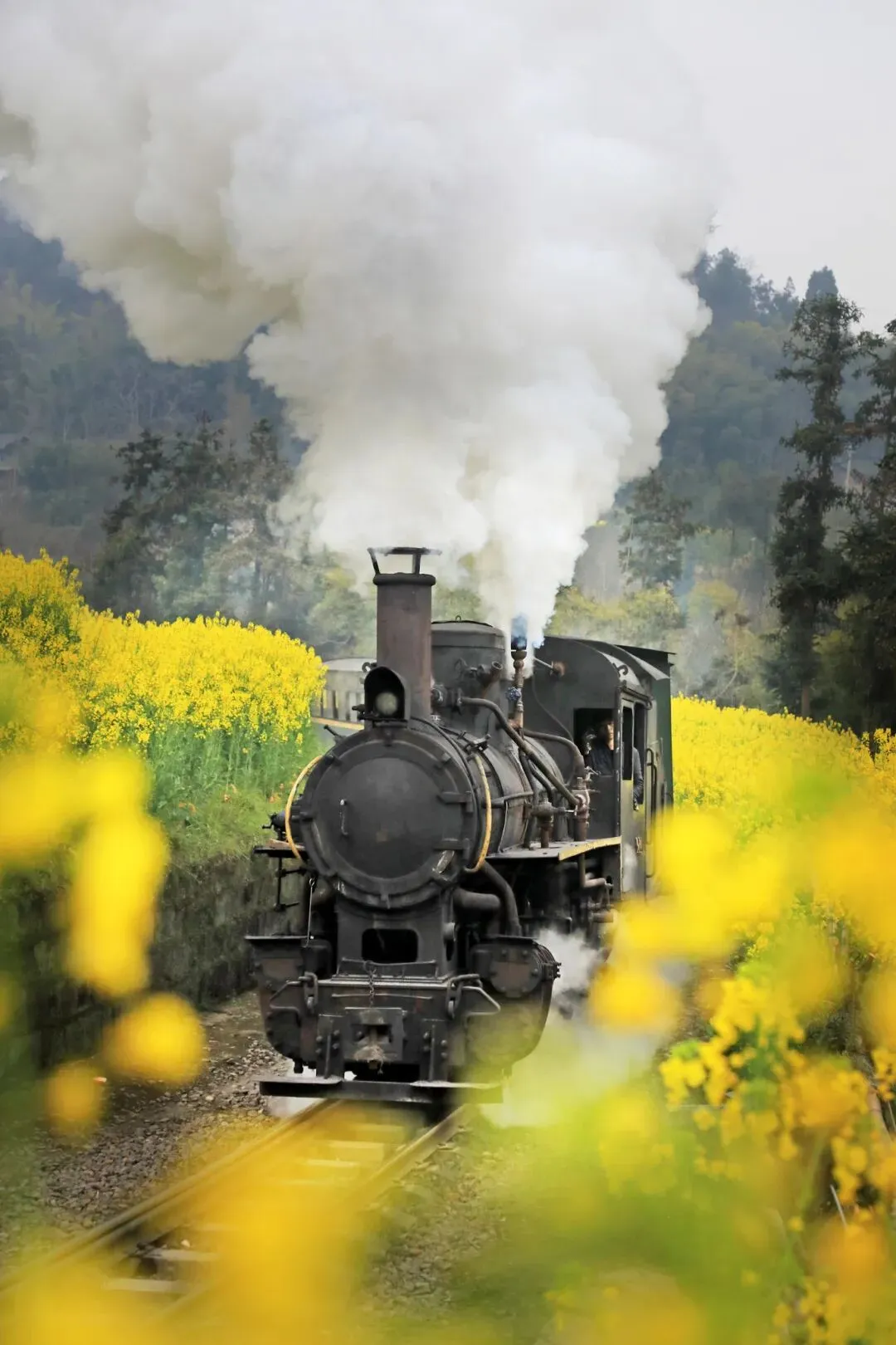 这列国内唯一运营的窄轨蒸汽小火车,鸣着汽笛穿越田野花海,随手一拍都是复古电影感大片。(油菜花开放以实际情况为准)