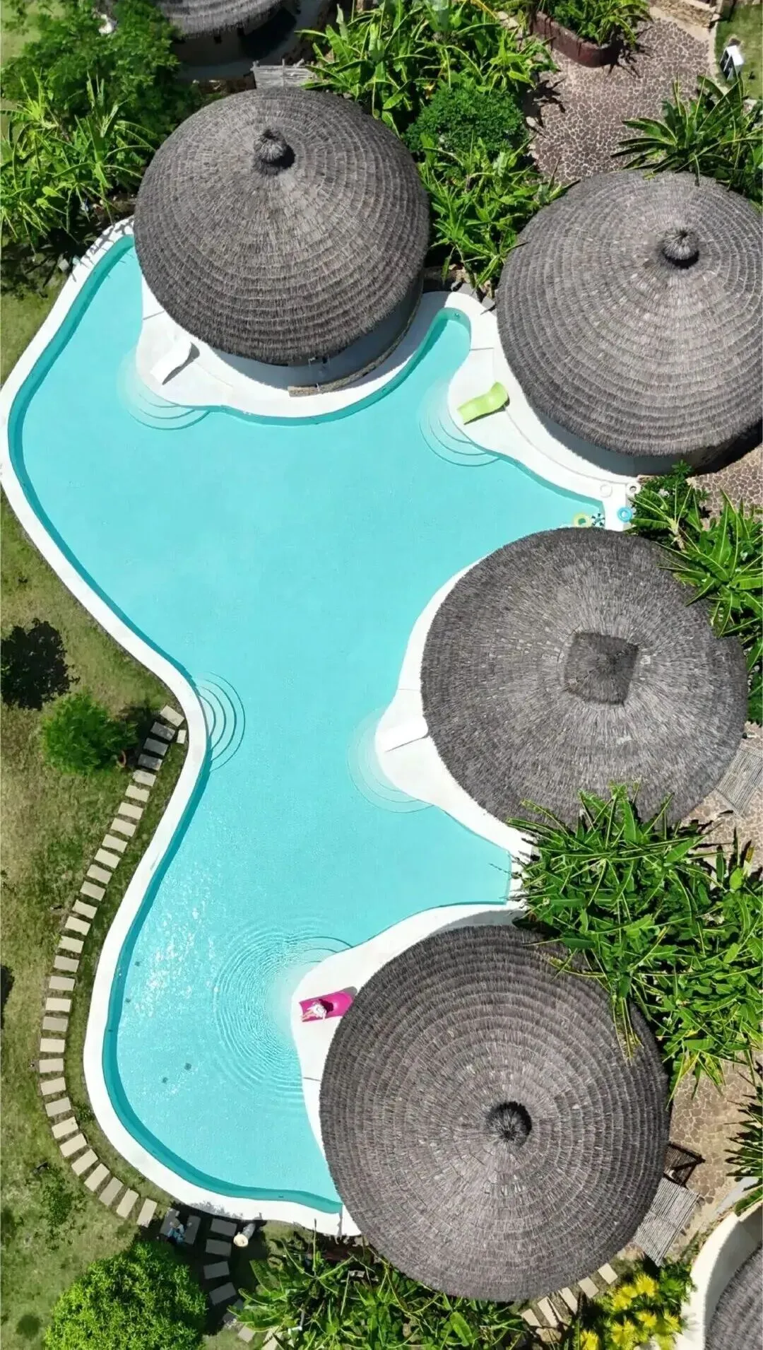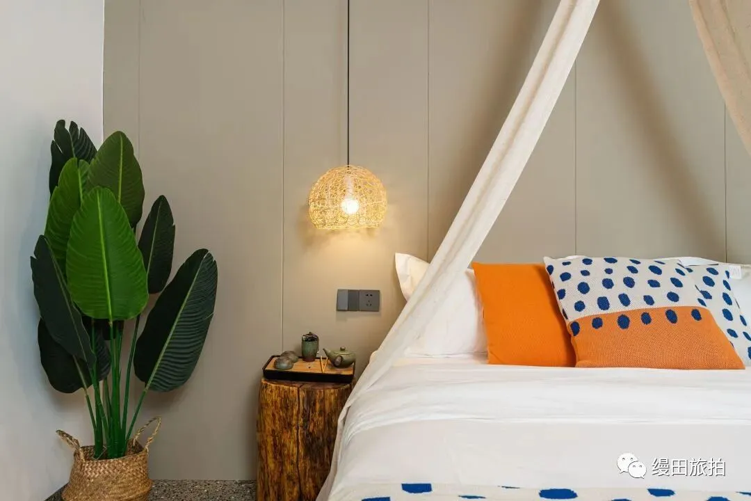 12间独栋Villa蘑菇屋,散落在山水之间,茅草屋顶与芭蕉林,再搭配热带绿植,充满东南亚风情。