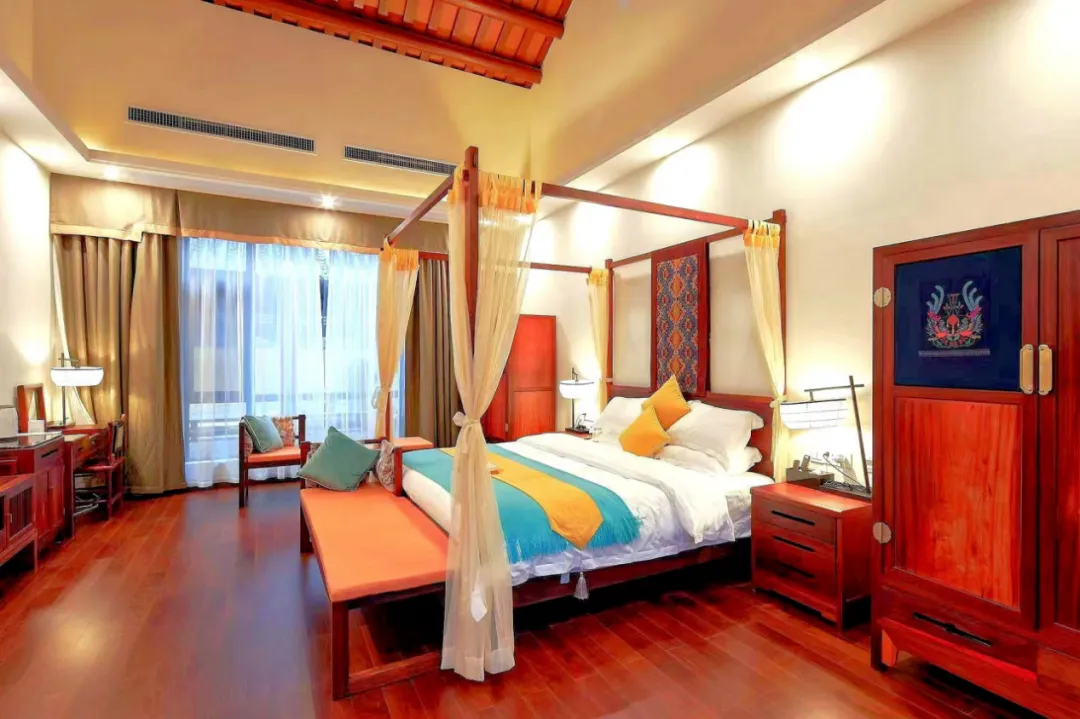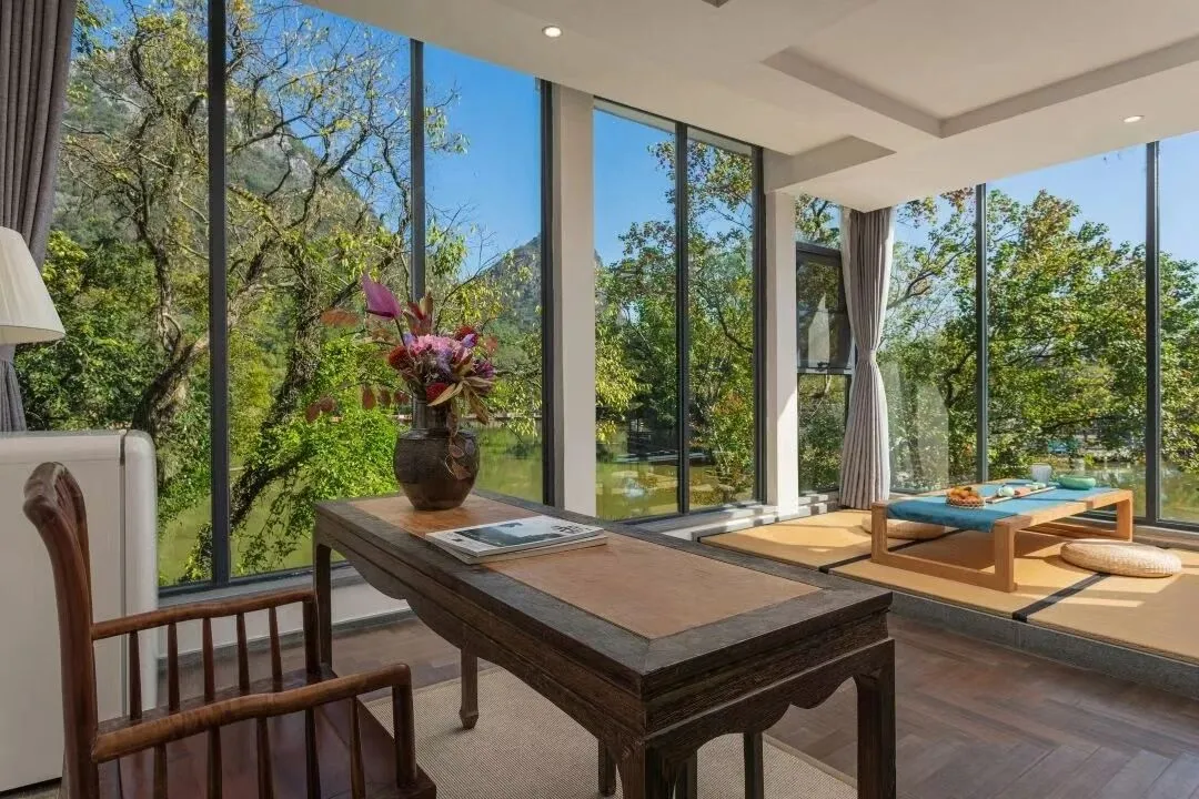 民宿以“古茶、禅意”中式风格为主,融入桂林传统建筑美学与山水特色。古树临窗,依山傍水的生态环境,配合自然光线设计的房间,使民宿内部自然通透,为客人提供舒适体验。