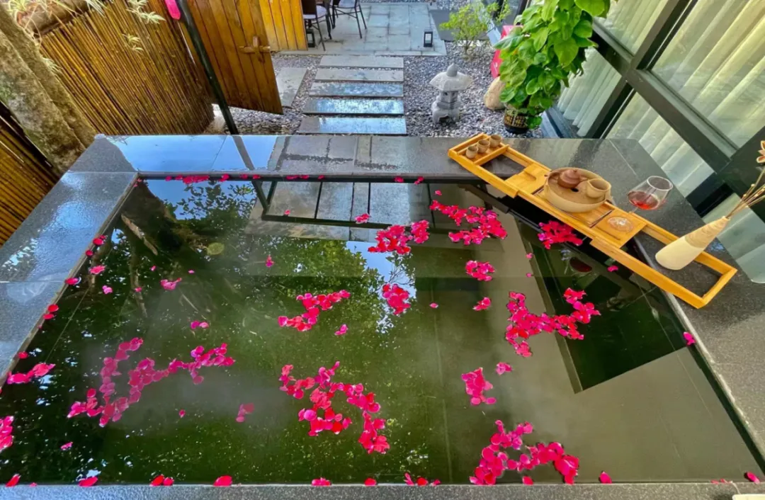 每间客房设立独立庭院,室内配备客厅、茶室、书房、温泉池、私人影院;室外有庭院花园、观景露台、泉水泳池、古桥流水、茶园竹海,让你品味时光的美好。