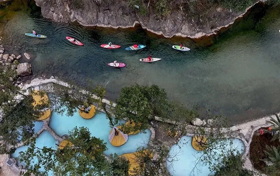 三姐故事森林美宿将自然与养生融合,沉浸在15.6万/cm³负氧离子的天然氧吧里,温泉水取自地下1300米地壳深层岩石断裂带,富含偏硅酸、氡、钠等30多种微量元素,属纯天然碱性氟型温泉。