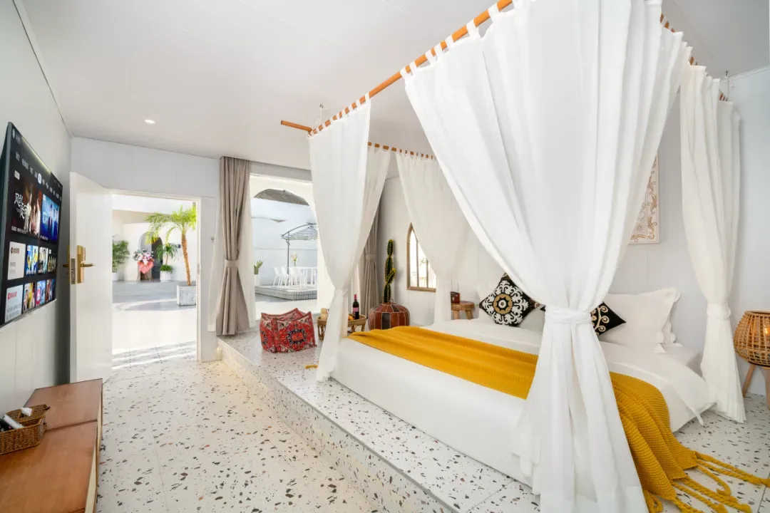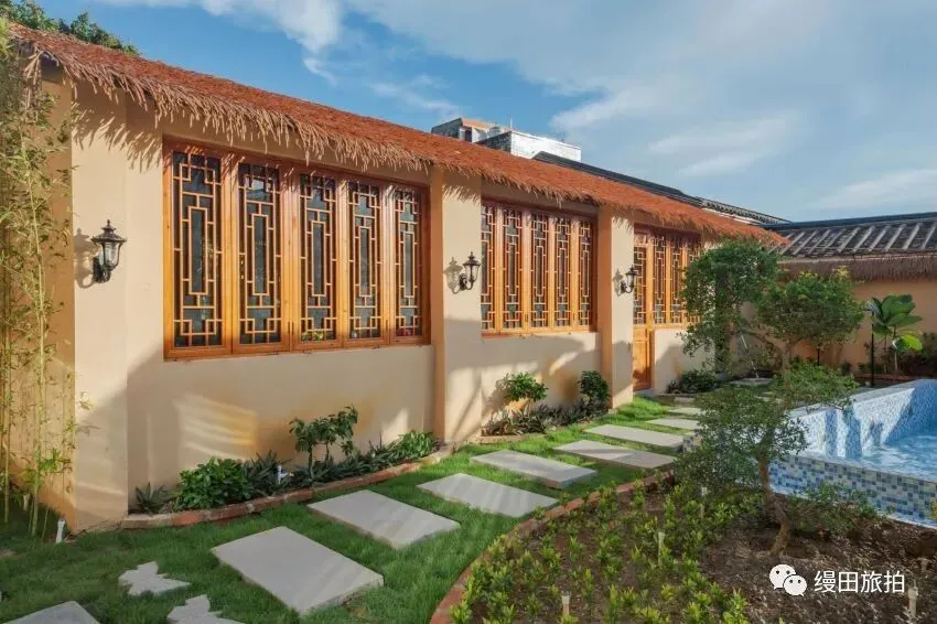 缦田旅拍美宿位于广西北海,主打独栋庭院式建筑,一院一景。推开民宿大门,映入眼帘的是天蓝方砖泳池与白色的建筑,在椰子树、热带植物的衬托下,仿佛置身地中海边的圣托里尼。