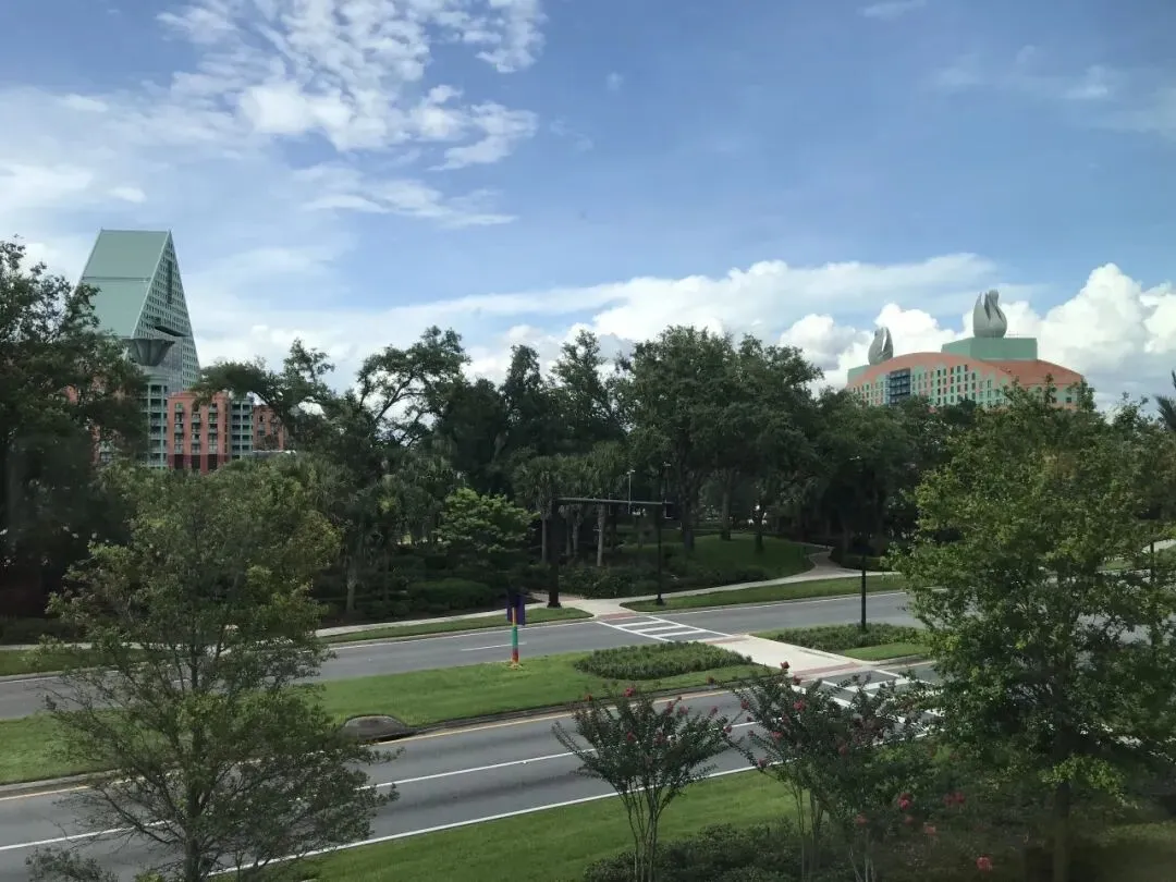 17:30到达迪士尼联名的天鹅堡酒店,窗外是迪士尼世界的风景,非常棒,房间也不错,把行李放好后稍作整理就迫不及待地来到迪士尼中心购票,坐接驳车去Disney Spring。