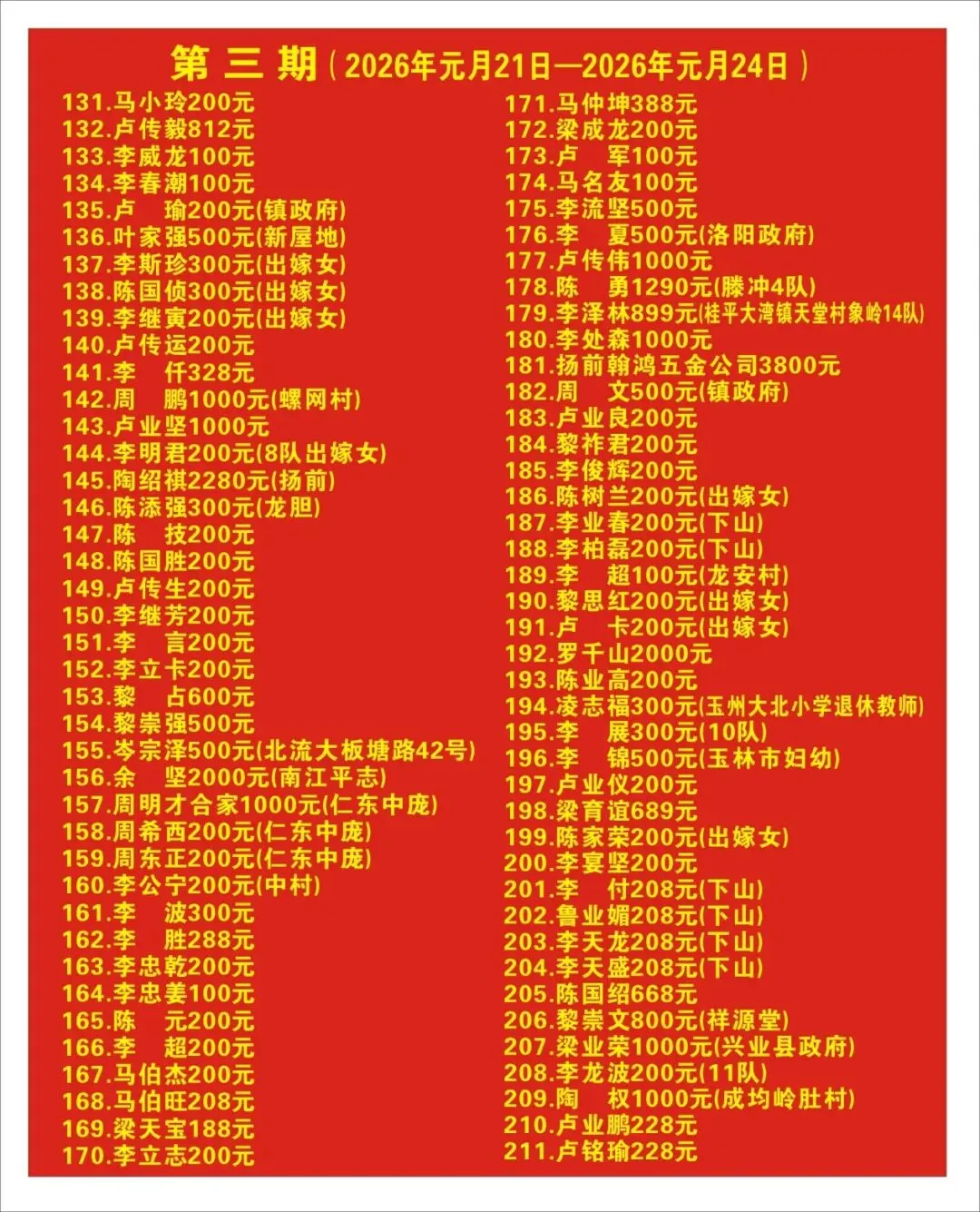每一笔捐款皆为家乡建设的心意,凝聚了各地乡友、干部、商户、学生等群体的同心助力,感谢每一位参与者的支持!