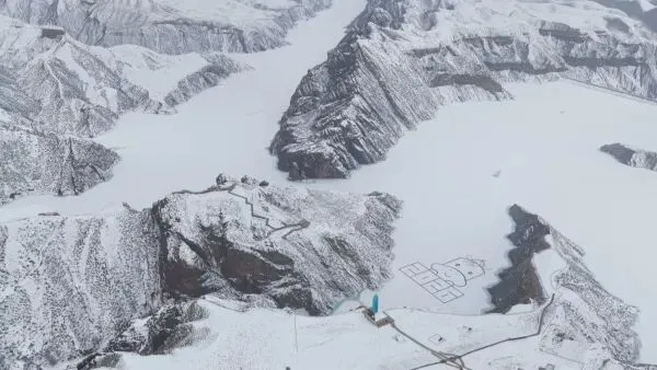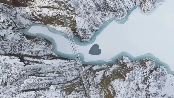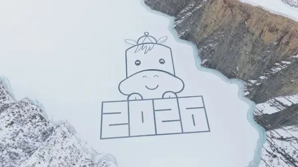 封冻的湖面上,“海蓝之心”“马到成功·2026”等简笔画在阳光下熠熠生辉,寥寥数笔,以冰为卷,以雪为墨,在剔透的冰层上勾勒出无限的意趣与遐想。游客漫步悬空玻璃桥,凭栏远眺,目光在蜿蜒的线条与苍茫的雪域间流转,尽览雪域风光的雄浑与柔情。