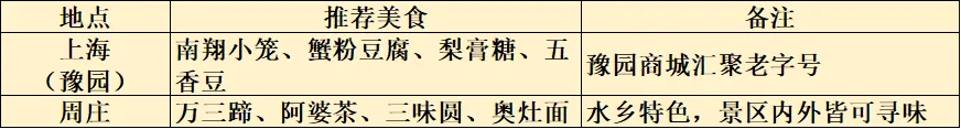 午餐:在豫园商城解决,可尝试南翔馒头店的小笼包、绿波廊的本帮点心或老城隍庙小吃广场的各种风味。