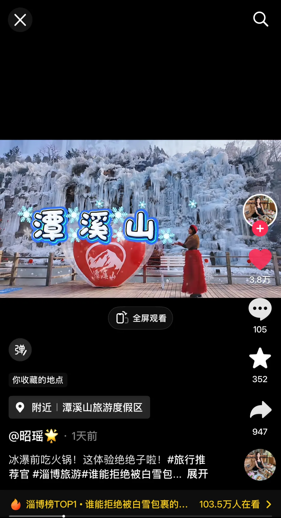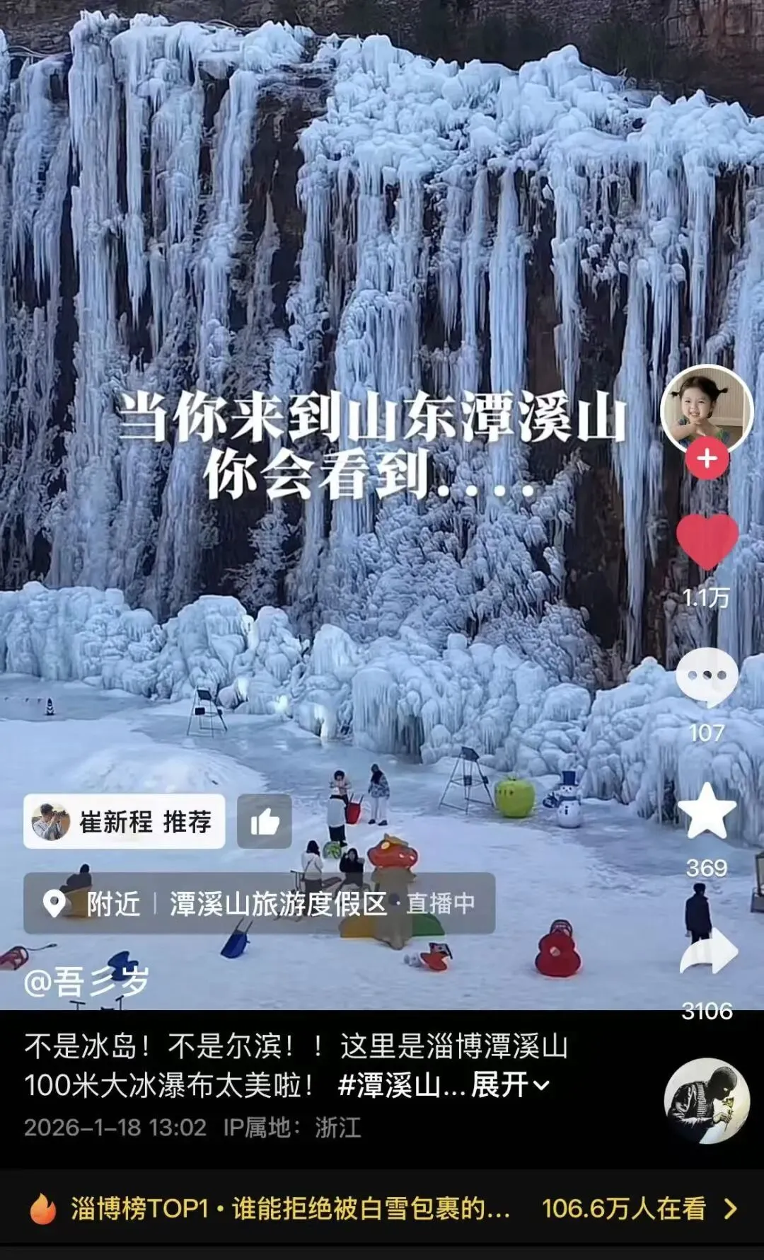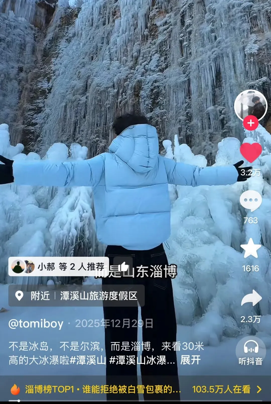“淄博潭溪山的冰瀑氛围感绝了,这才是年轻人该有的冬日出逃计划,与冰雪同框的治愈感,把压力喊向山谷的释放感,和朋友疯玩一整天的幸福感,在这里统统集齐啦!”