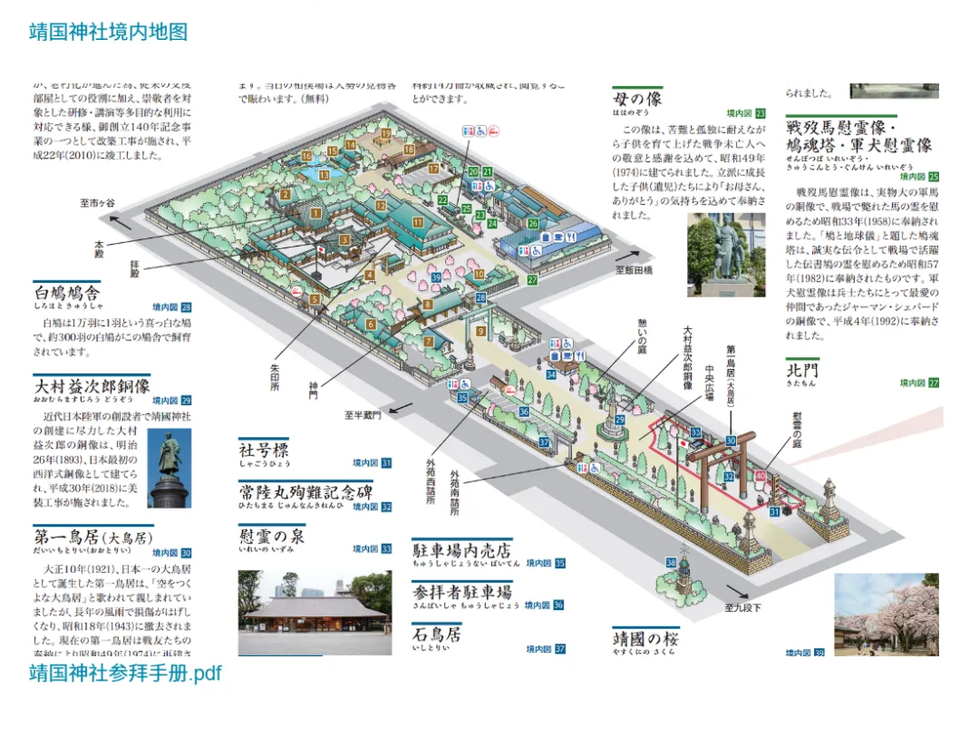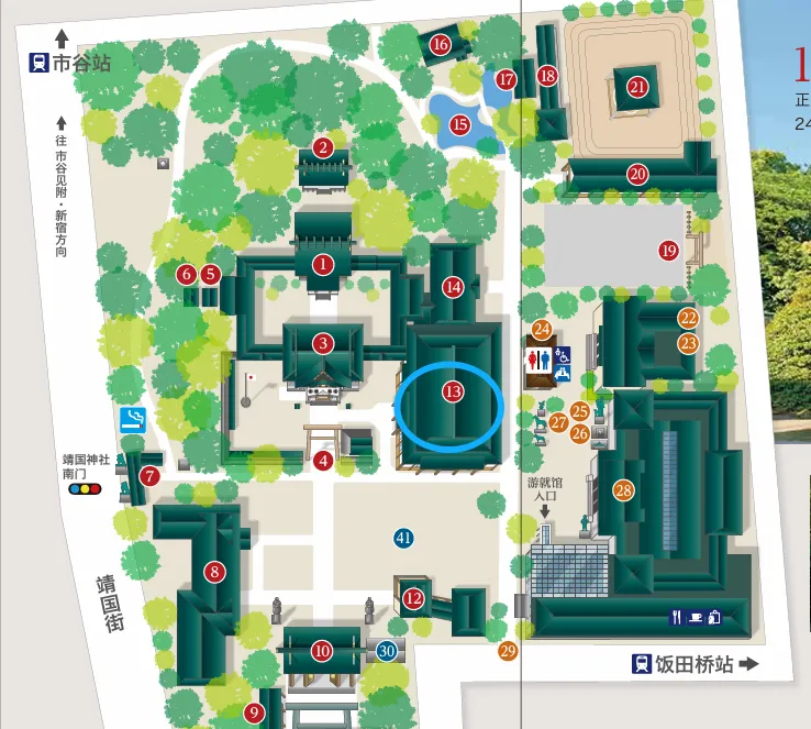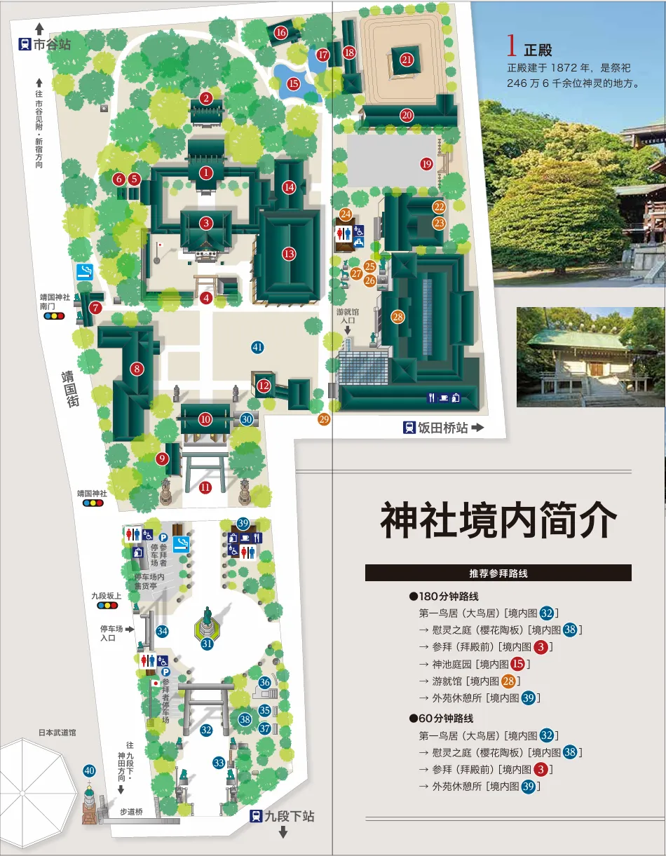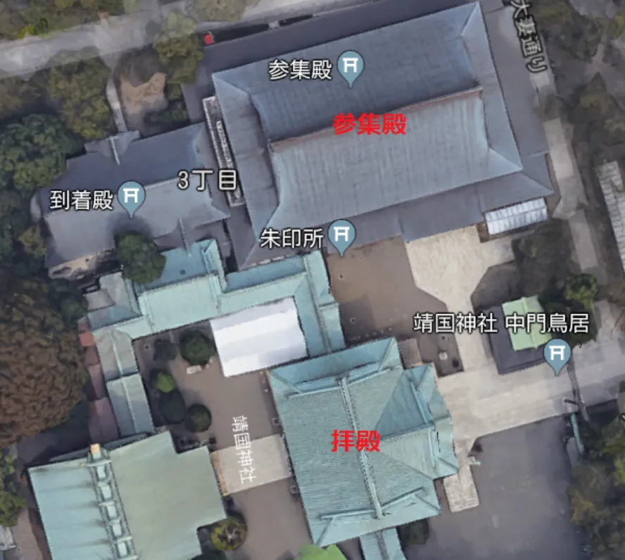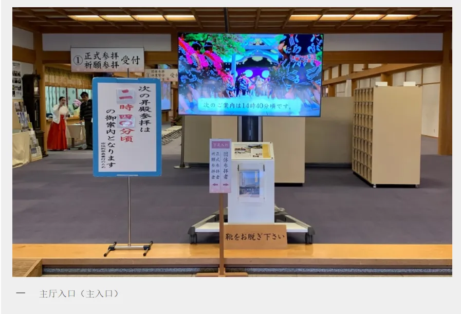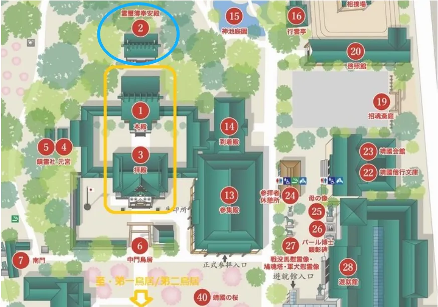 殿内设有为正式参拜的遗属和崇敬者个人或团体提供的登记处、休息室以及朱印(参拜证明)所等设施。