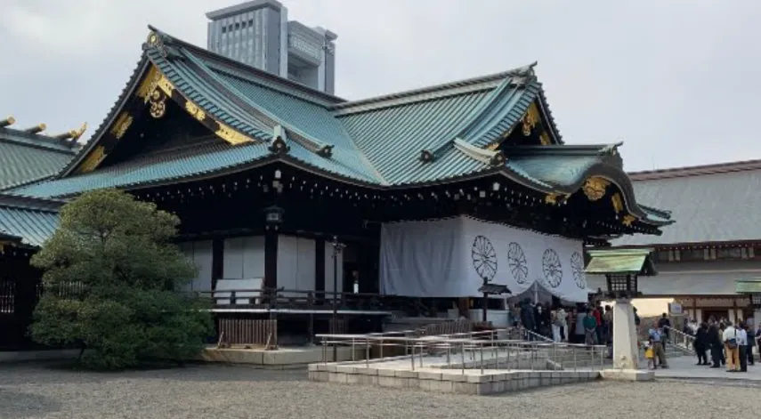 “拜殿”为靖国神社中轮廓最大建筑。该殿最引人注目的,是从屋檐两边垂下的巨幅布幔和两扇大门上金黄色的菊花徽章。菊花徽章系日本皇室专用徽章,此徽章见于大门,当为日本军国主义时代“国家神道”遗留给靖国神社的经典痕迹。