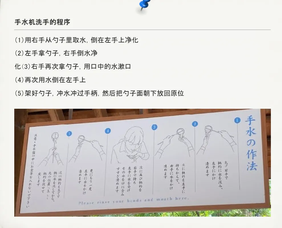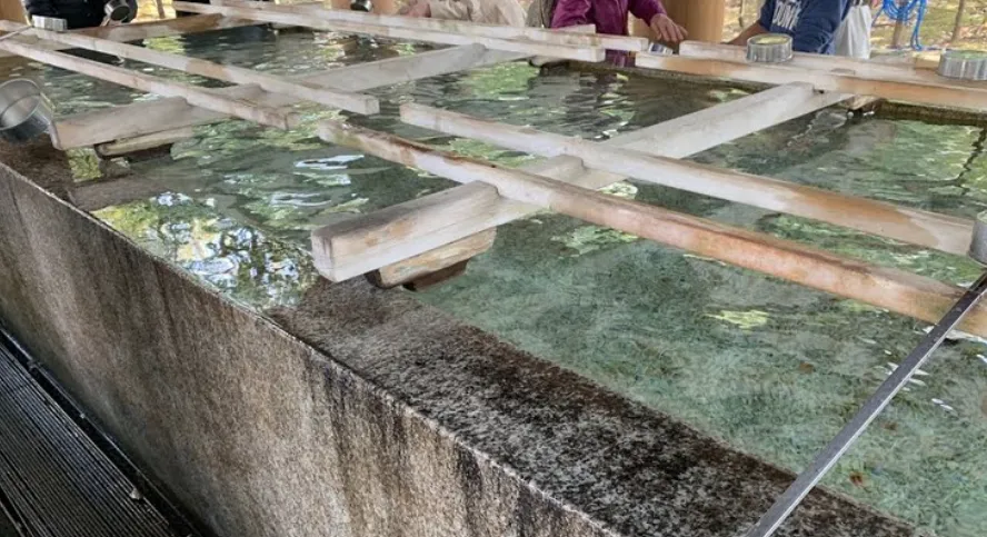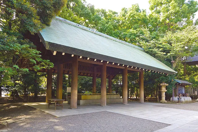 大手水舍是侨居美国的日本人于1940年奉纳至靖国神社的。该洗手水盘采用花岗岩制成,重达18吨以上。在参拜前,需要在此进行净身仪式:清洗双手,然后漱口。