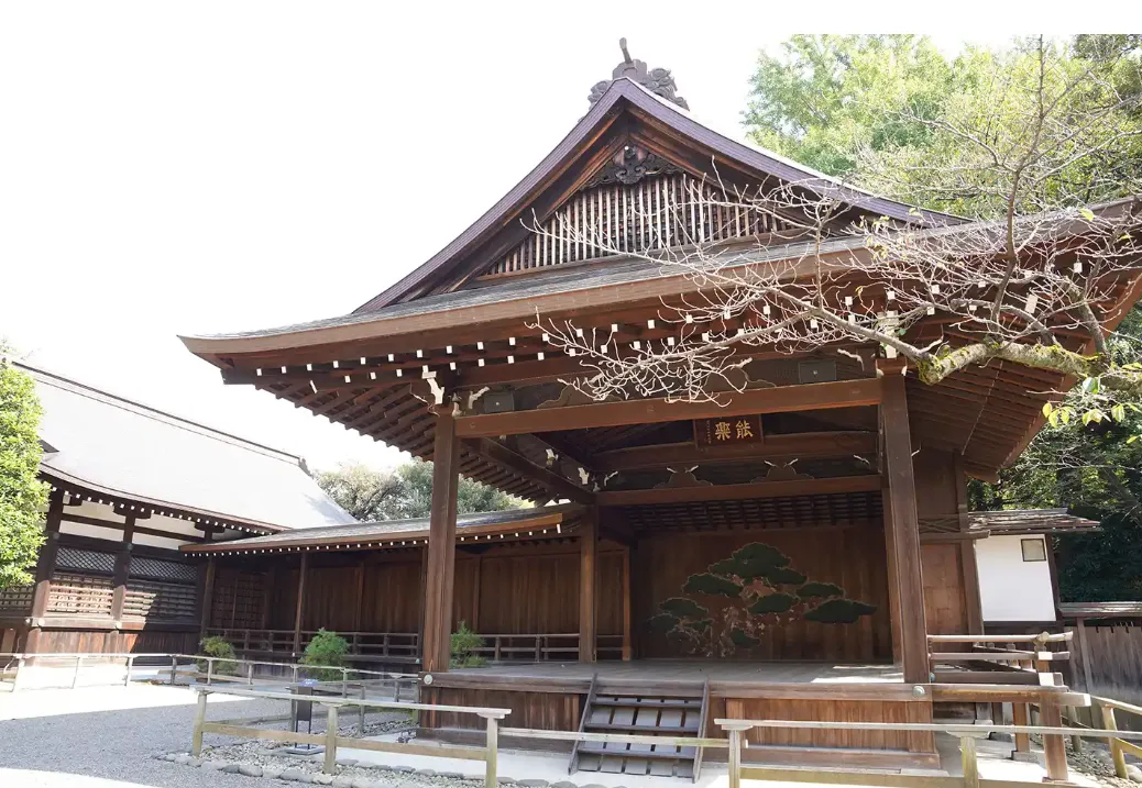 能乐堂原是1881年建在东京芝公园的能舞台,1903年被奉纳并迁移至靖国神社。在此舞台上,表演用来敬献神灵的能乐和日本舞蹈等传统艺术。