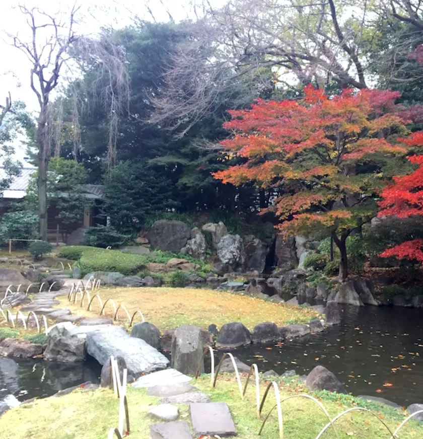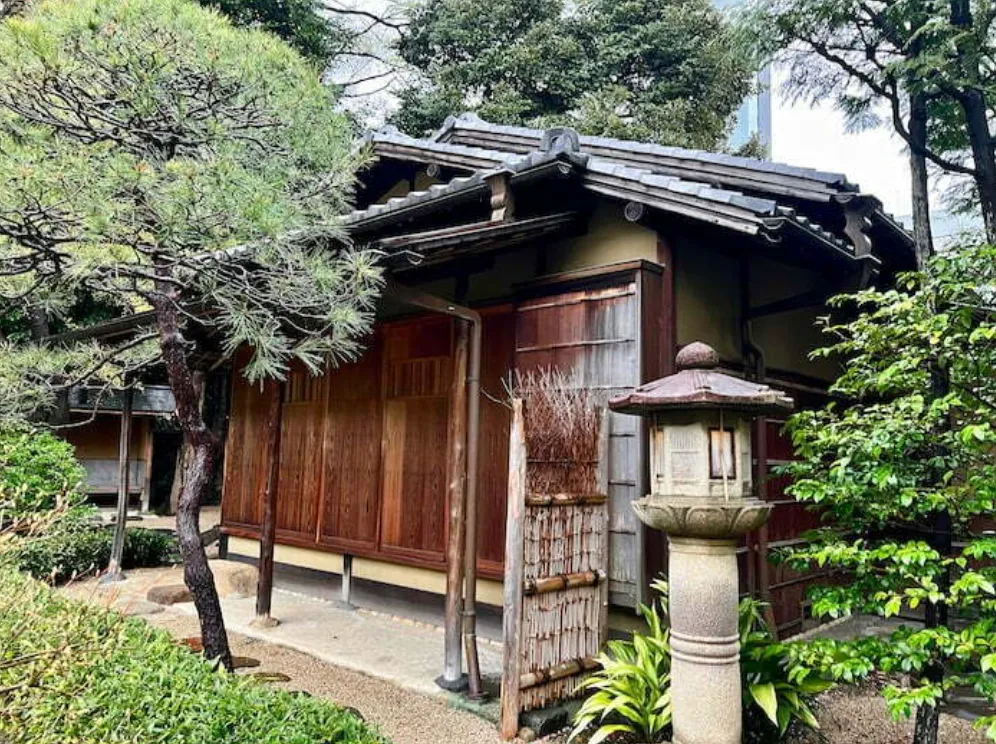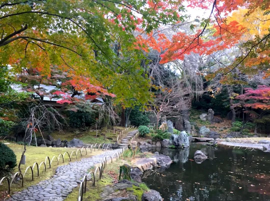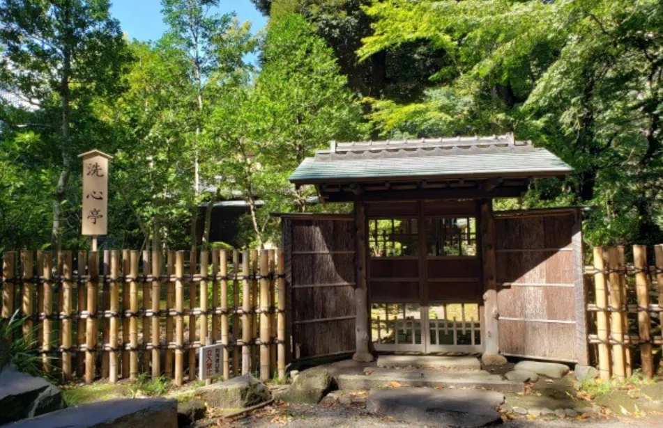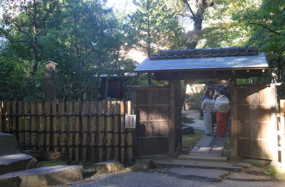 这座庭园建于明治初期。通过1999年的修复施工,人们才发现它是一座屈指可数的日本名园。该庭园的最大亮点在于回游式设计,瀑布石头组合让人联想到深山中的景致。园中设有日本最长的花岗岩直桥。