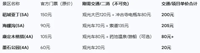 稻城亚丁,一张门票价格大约是150元,但是,如果游客想真正走进景区深处看到神山,120元观光大巴和80元电瓶车是躲不开的刚需。