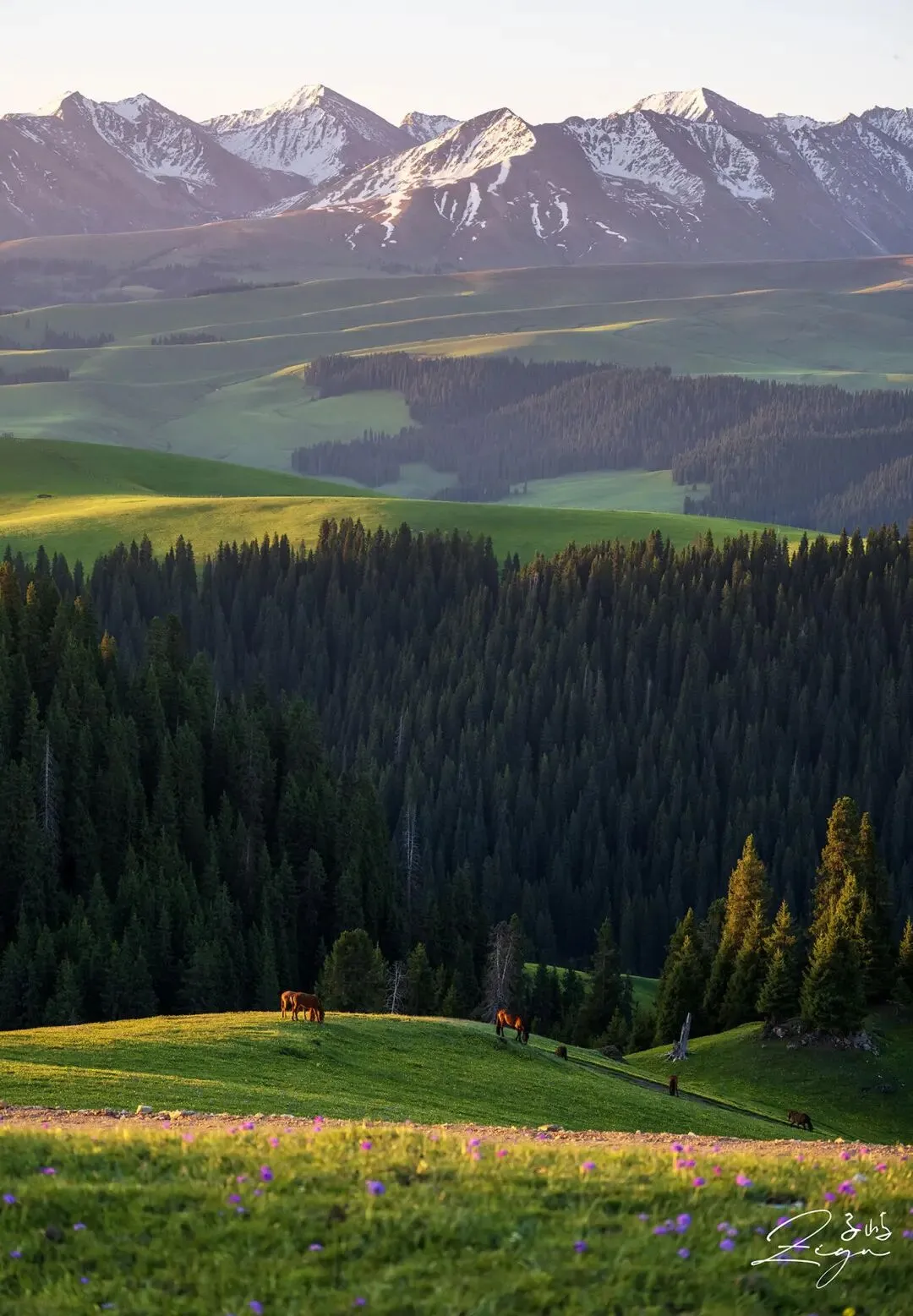 草原不是平面,是上帝随手折叠的绿绸。风一掀,千层浪;云一沉,万匹缎。五月的野花是即兴刺绣,羊群的蹄声替哈萨克人敲着鼓点,整片山地变成一座没有屋顶的剧院。