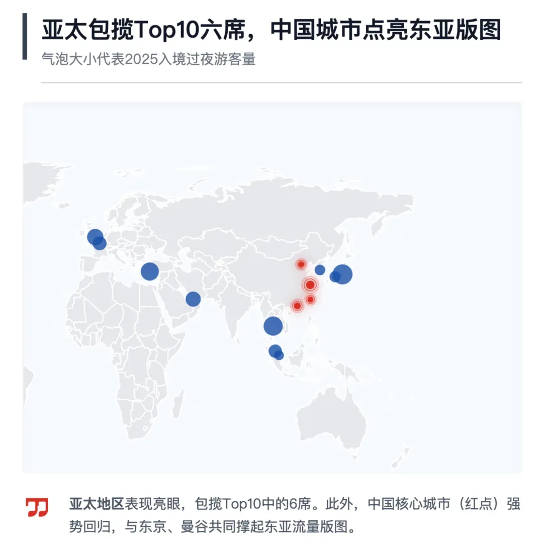亚太地区表现亮眼,包揽Top10中的6席。此外,中国核心城市(红点)强势回归,与东京、曼谷共同撑起东亚流量版图。