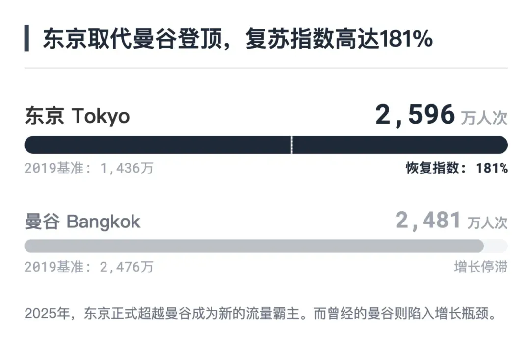 2025年的全球旅游版图(入境过夜游客)显示,东京以181%的复苏指数取代曼谷登顶,叠加中东城市300%的爆发式增长,证明了在全球高通胀背景下,极致的性价比或颠覆性的服务体验,更能在存量博弈中获得游客的关注。