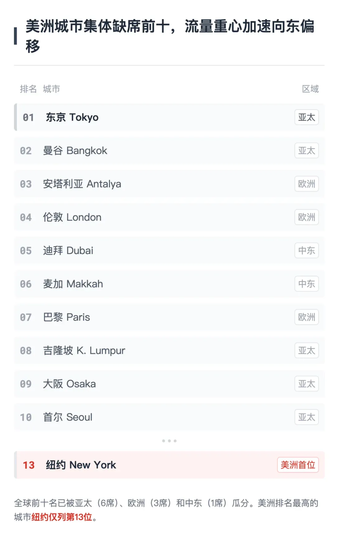 中国免签政策的“阀门效应”正在加速释放,与之形成鲜明对比的是美洲城市在Top10中的集体缺席。单一依赖传统IP已无法对抗长途旅行成本的飙升,世界旅游的重心或已向“体验更优、成本更低”的东方倾斜。