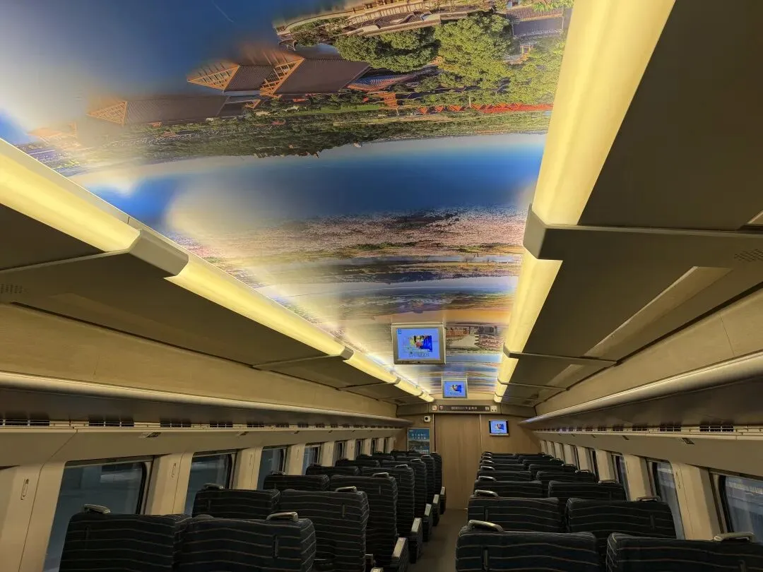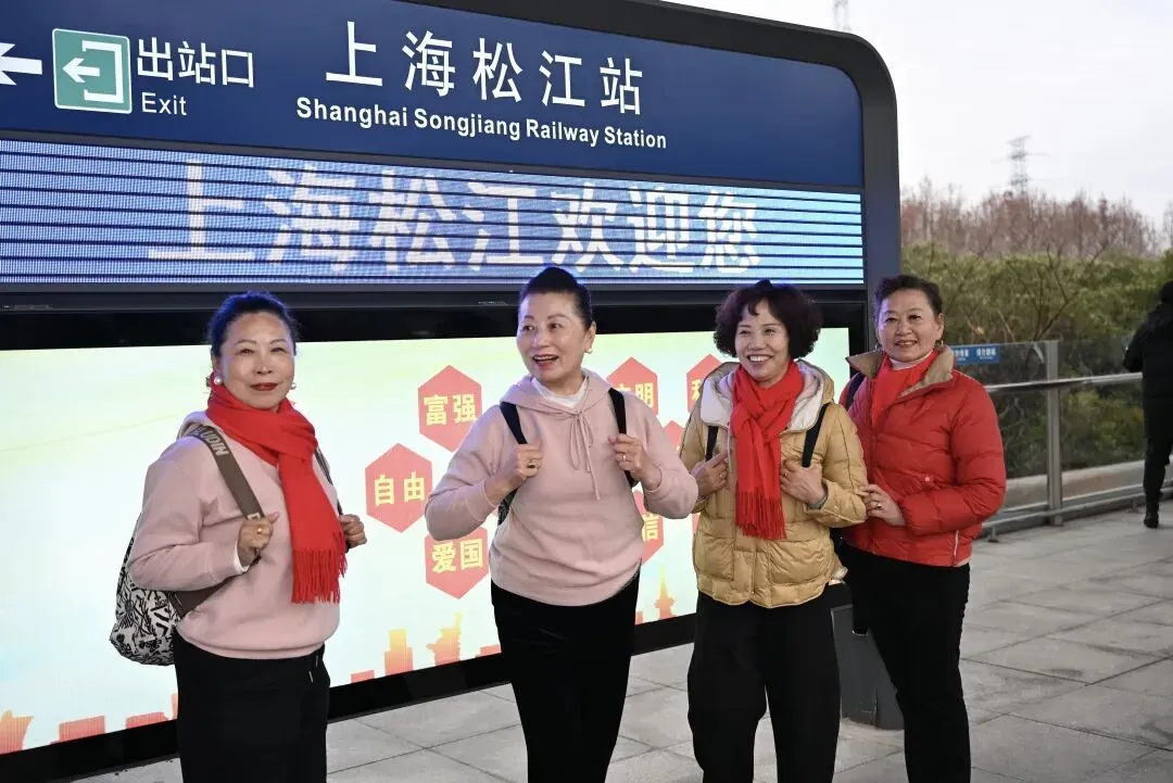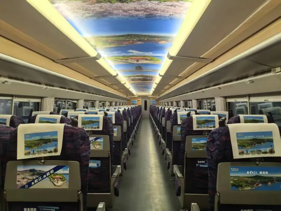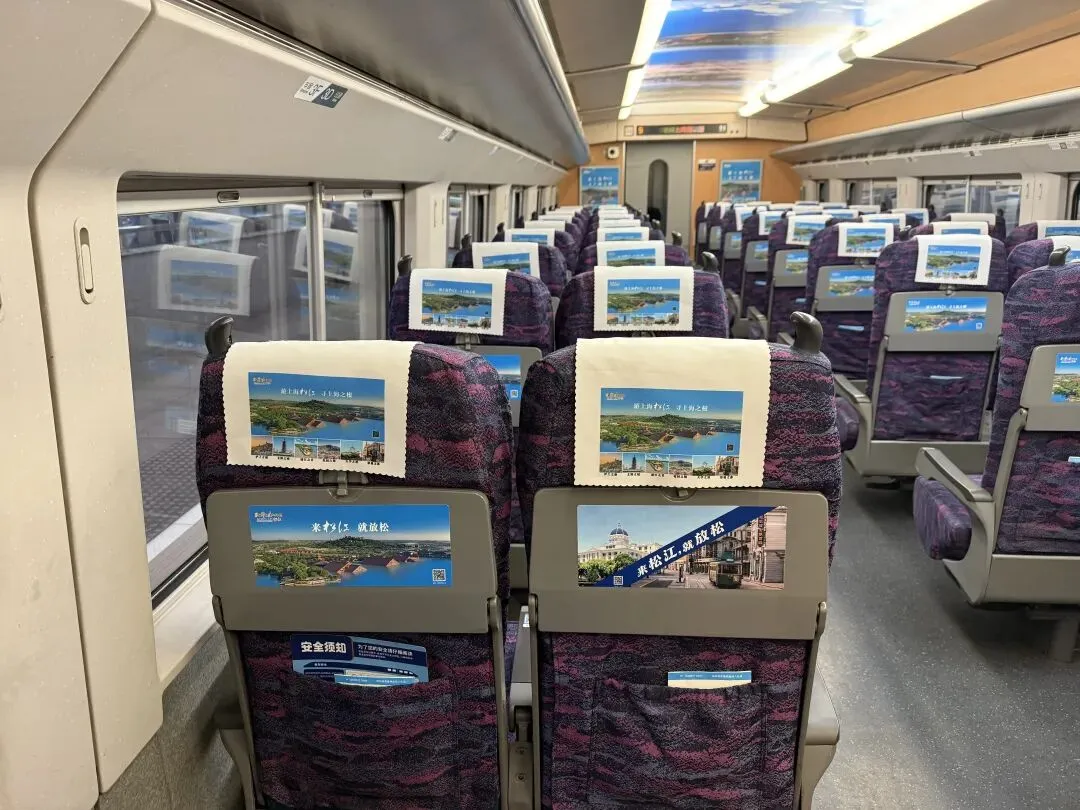谈及旅途感受,有游客直言:“以前觉得千里之外的美景很遥远,现在高铁让旅游成了常态。这趟专列不仅速度快,车厢里全是松江元素,抬头是佘山苍翠,低头是广富林美景,小桌板都成了风景画报,根本不像在坐高铁,反而像走进了沉浸式展厅,坐着都是一种享受。”
