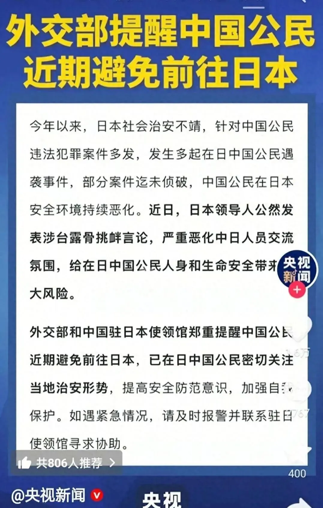 官方提醒中提到,近段时间日本社会治安不靖,针对中国公民违法犯罪案件多发,部分地区连续发生地震。这一提醒的直接背景是日益紧张的中日政治关系。