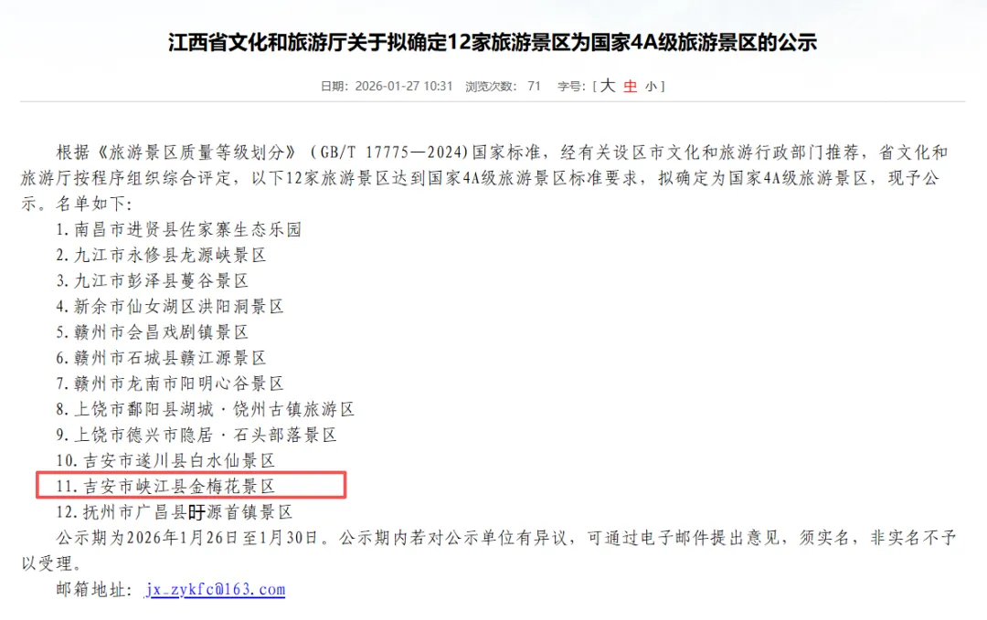 根据《旅游景区质量等级划分(GB/T17775-2024)国家标准,经有关设区市文化和旅游行政部门推荐,省文化和旅游厅按程序组织综合评定并于2026年1月30日完成公示,确定以下12家旅游景区为国家4A级旅游景区,我县金梅花景区获评国家4A级旅游景区。
