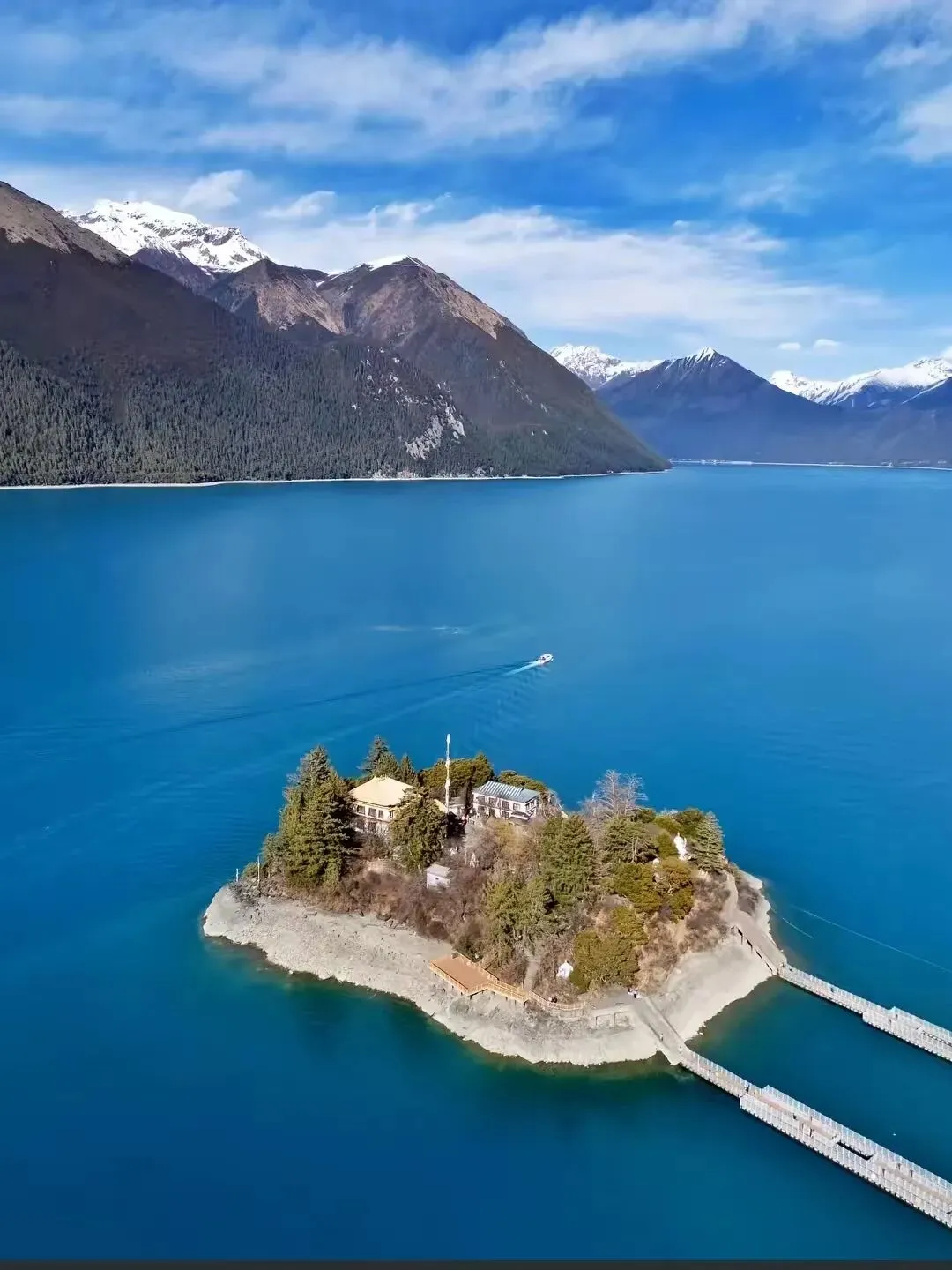 第二站:湖心岛——漂浮的佛教圣地巴松措的灵魂所在。一座小巧的岛屿通过长长的栈桥与岸边相连,岛上林木葱郁,有唐代始建的措宗贡巴寺(意为“湖中城堡”)。寺内供奉莲花生大师,留存着古老的生殖崇拜图腾,充满神秘色彩。绕岛一周,不同角度皆是风景。