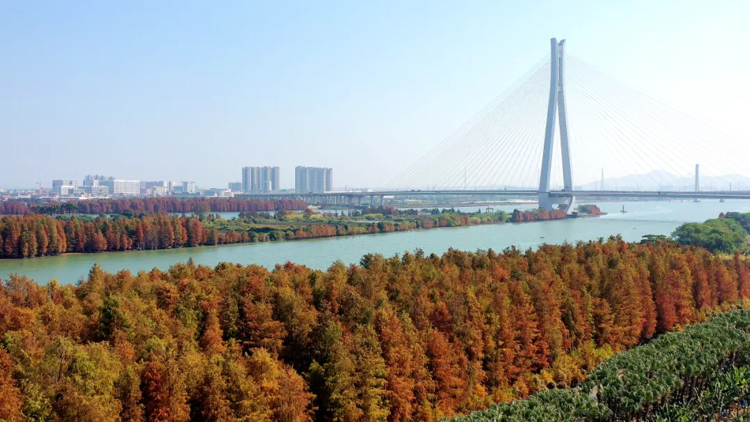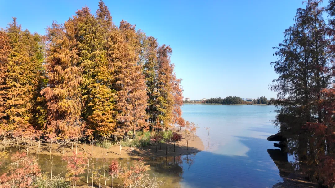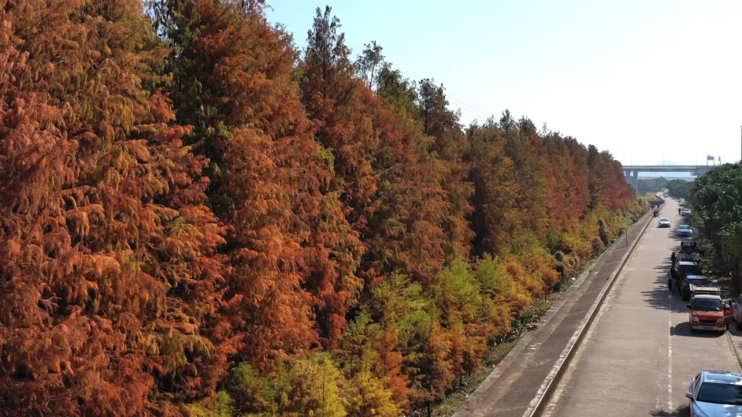 中顺大围马大丰段是“港口八景·杉群竞秀”代表景点,面积约5万平方米。冬日的落羽杉褪去翠绿,换上了红棕、焦糖交织的“美拉德”盛装,阳光透过枝叶洒在林间,地面铺满层层叠叠的落叶,踩上去沙沙作响,随手一拍都是氛围感拉满的大片。傍晚时分,夕阳西下,余晖为落羽杉镀上一层金边,光影交错间,仿佛闯入了童话世界。