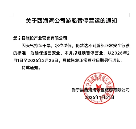 九江文旅一卡通运营中心接到合作景区西海湾景区的通知,因天气持续干旱,水位过低,仍然达不到游船正常运营的标准,为确保运营安全,景区于2026年2月1日至2026年2月23日暂停营业,具体恢复正常营业日期另行通知。特此通知!