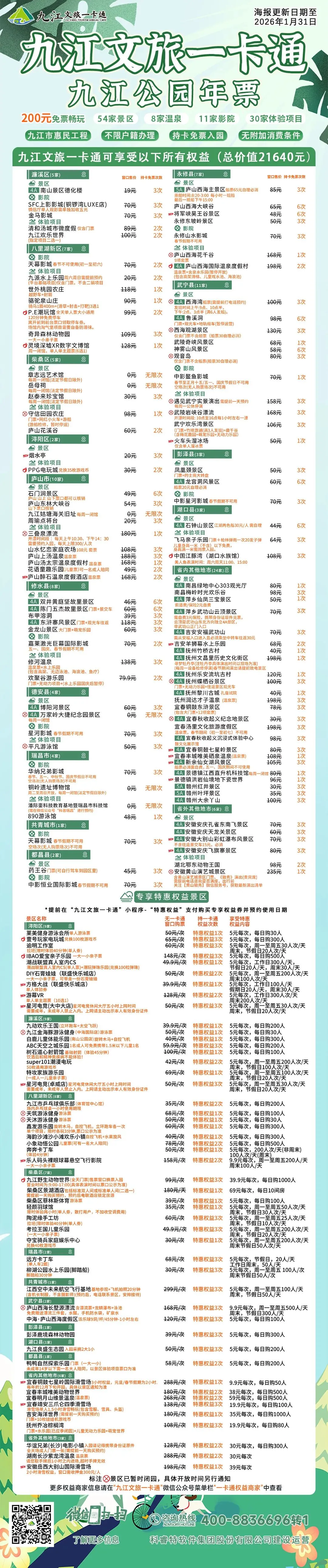 请大家相互告知!为了保障大家的入园体验及出行安全,请在出行前拨打九江文旅一卡通客服热线400-8836-696转1或拨打景区电话咨询是否营业,且随时关注“九江文旅一卡通”官方公众号以及用户会员群内消息,并相互转告。
