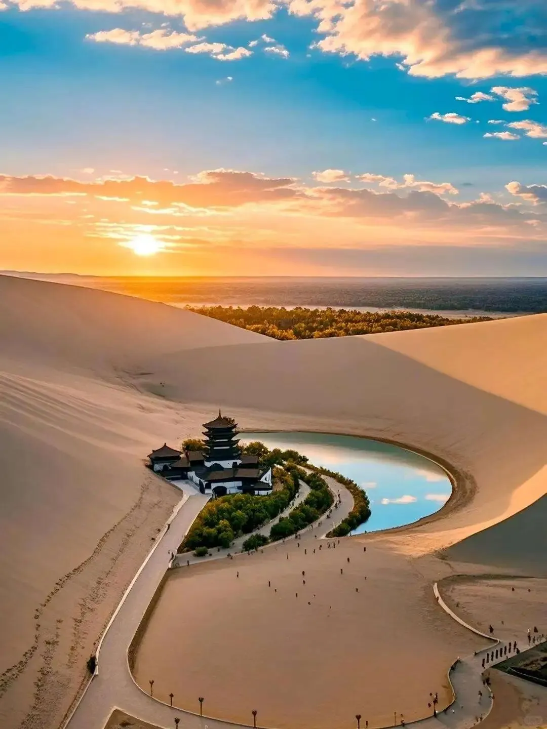 坐在鸣沙山上看.夕阳把月牙泉染成.蜜色,.沙子凉了,.风里有.遥远的.驼铃响。莫高窟.的讲解员打着手电,光束照亮壁画一角,那些.飞天衣带好.像还.在.飘。夜市.上杏皮水酸甜冰凉,配一把红柳烤肉,西北的夜就.踏实了。