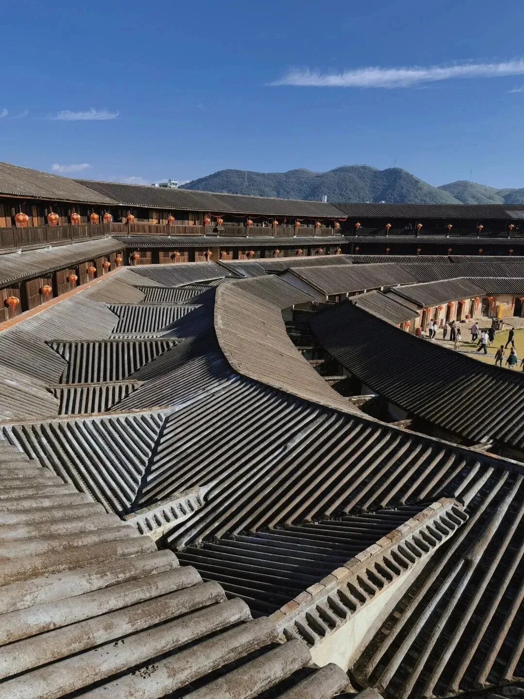 这楼建于明朝万历十五年,430多年了!啥概念?比你爷爷的爷爷的爷爷还老。它不长那普通圆形的样儿,人家是正儿八经的八角形,像朵大花似的绽放在半山腰。外头一圈,里头还有一圈,再里头还有一圈,足足72间房、32口井、112架梯!你就琢磨吧,32口井,那时候没自来水,这得供多少人喝水啊?