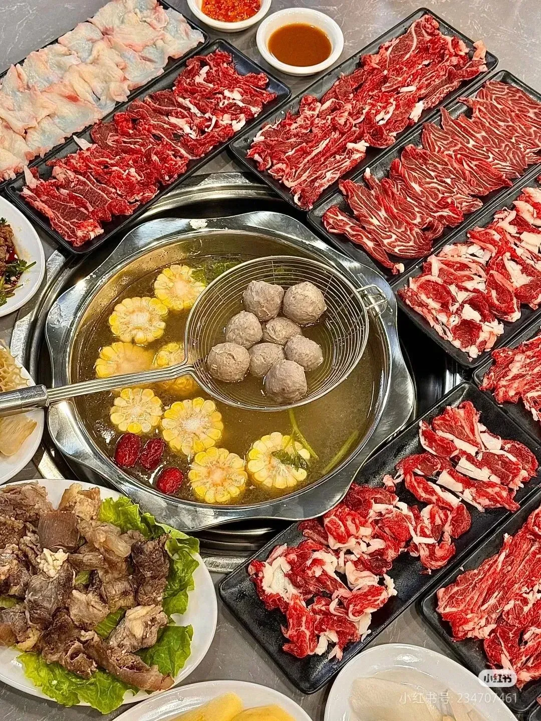 潮汕牛肉火锅——这可比城里头那些冷冻肉片子强老了!现杀的牛,肉还跳呢就切片上桌了。吊龙、匙柄、五花趾,薄薄的,涮三秒,蘸上沙茶酱,嫩得能在舌头上打滑,香得你找不着北。