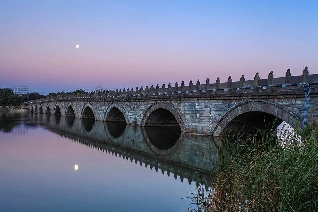 意境:天刚蒙蒙亮时,弯弯的残月挂在天上,卢沟桥的石狮子和桥身映在永定河里,氛围感拉满。