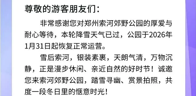 1月31日,记者从老君山、郑州索河郊野公园、龙潭大峡谷等景区了解到,当前天气情况转好,景区道路恢复畅通,已达到开园条件。周末有出游计划的朋友请及时关注各景区发布的相关信息。部分景区开园公告如下: