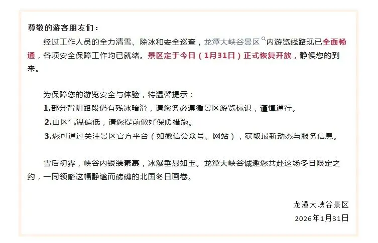 经过工作人员的全力清雪、除冰和安全巡查,龙潭大峡谷景区内游览线路现已全面畅通,各项安全保障工作均已就绪。景区定于今日(1月31日)正式恢复开放。