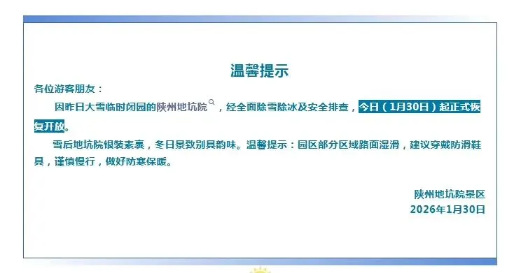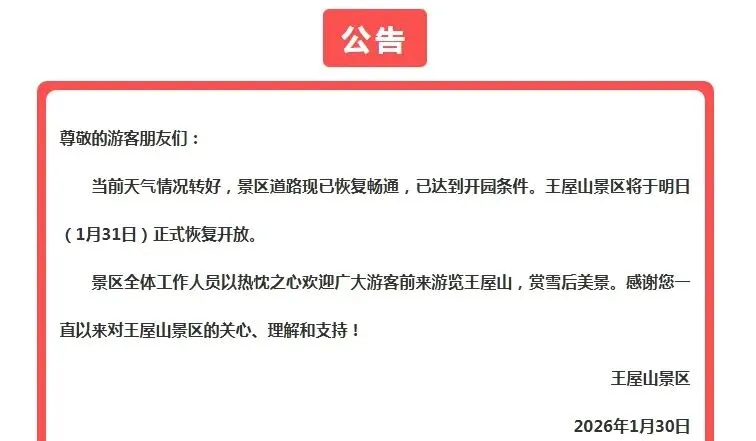 经全面除雪除冰及安全排查,该景区已于昨日(1月30日)正式恢复开放。