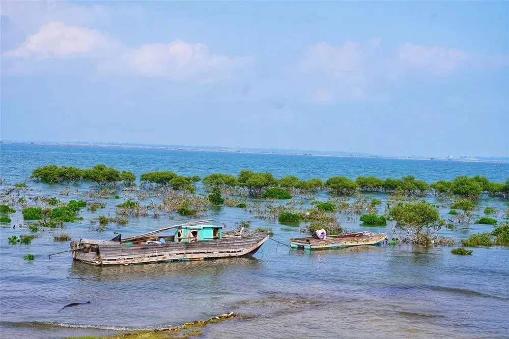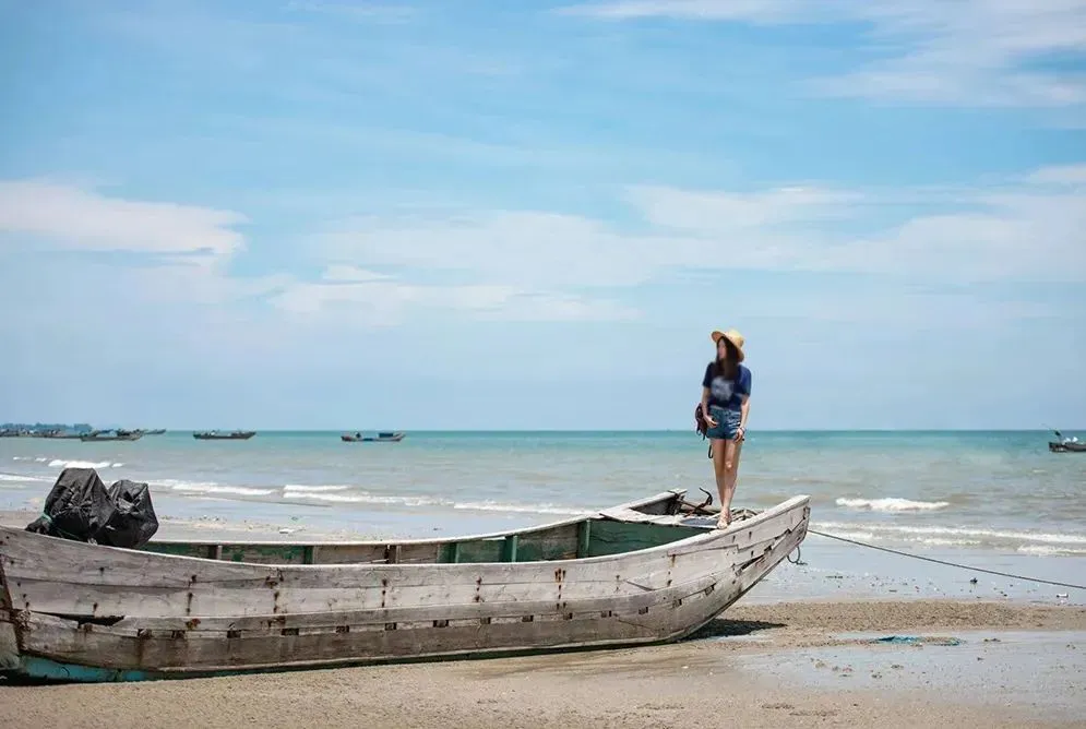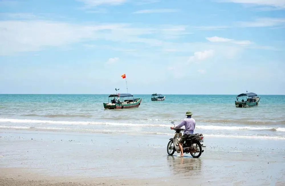茶古金滩 “越南浪漫的海滩”,长达17公里, 白色平滑的沙滩、青绿的海水,最为吸引人。 沿着海岸线是防沙和挡风的木麻黄林, 忽隐忽现的是海滩空心菜花, 点缀了沙滩风景。