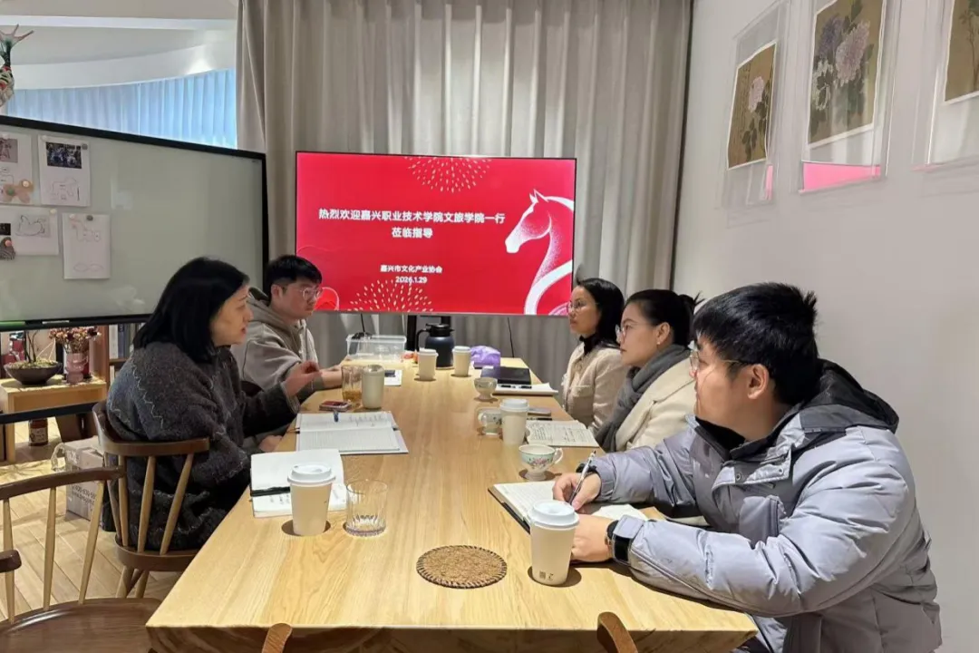 2026年1月27日上午,嘉兴职业技术学院文化与旅游学院党总支书记陈希赟携文化创意与策划专业张建英、黄嘉秋一行,赴嘉兴市文化产业协会开展行业调研交流,市文化产业协会秘书长吕虹、副秘书长韩丞及工作人员沈燕出席会议。此次调研紧扣“十五五”规划编制需求,围绕职业技能培训与认定、行业竞赛、美育实践、非遗传承及课程开发等重点议题展开深入研讨,旨在以行业协会为桥梁,进一步健全学校、行业与企业协同参与的长效合作机制,推动文创专业人才培养与区域文化产业发展需求的深度融合。