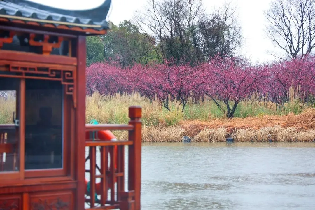 与木栈道、亭台、屋舍和芙蕖岛的梅花互相交织,