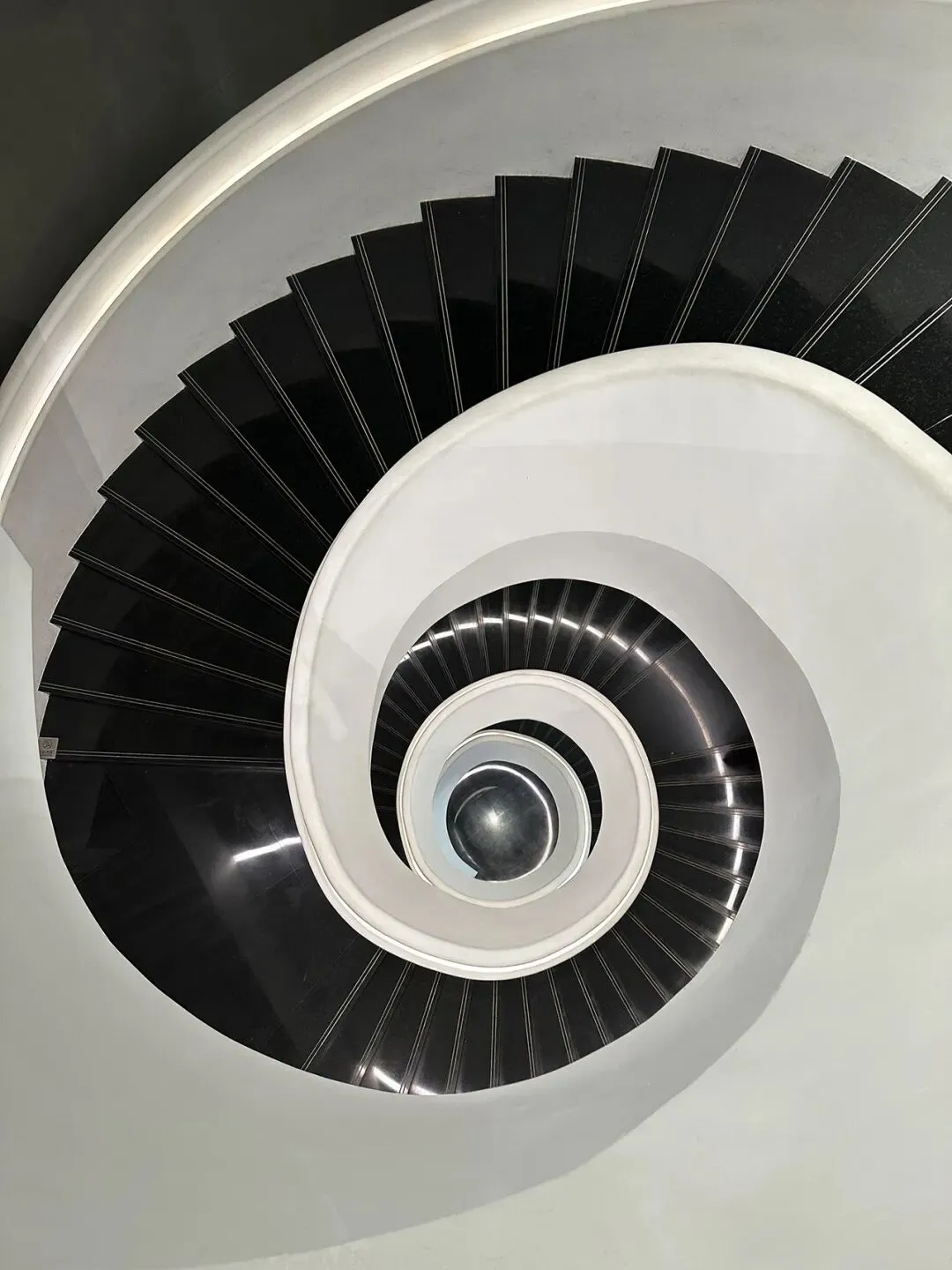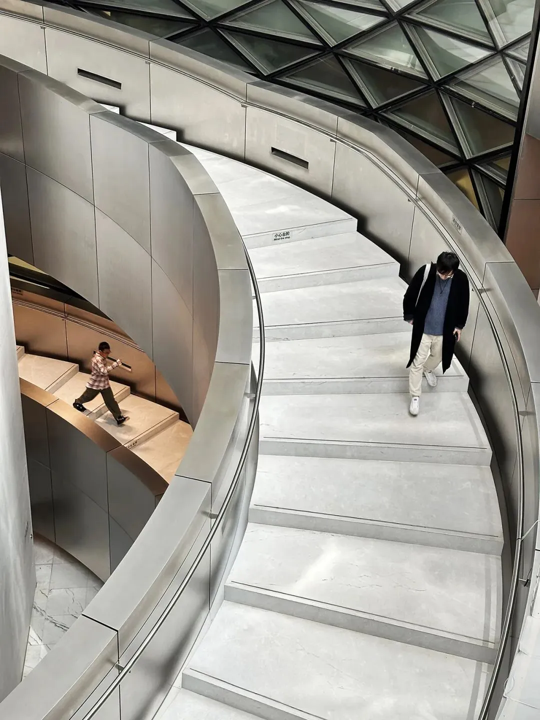 (2)美术馆内五层楼高黑白旋转楼梯,是必打卡点,用广角镜头从顶部俯拍或从底部仰拍,可充分展现其螺旋形的几何美感。