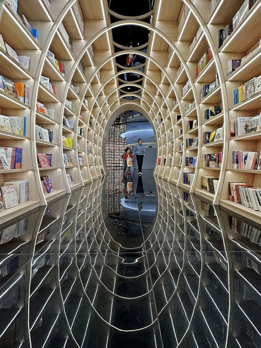书店内排列整齐的拱形书墙惊艳、震撼,光影的美感层层递进,读者仿佛穿行于时光隧道,穿过“隧道”后豁然开阔,映入眼帘的是环形“书海”,仿佛置身于盗梦空间。