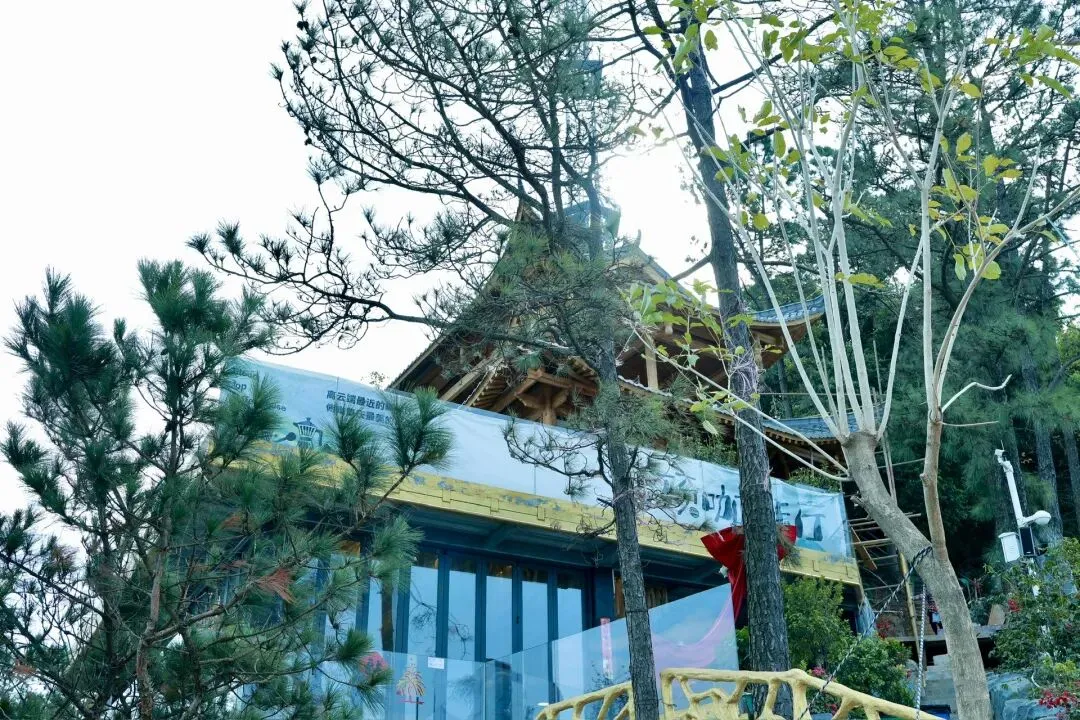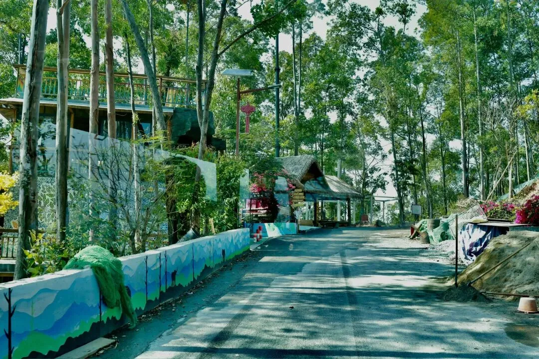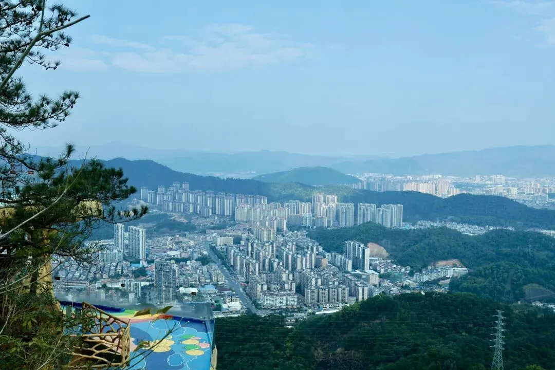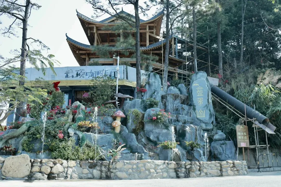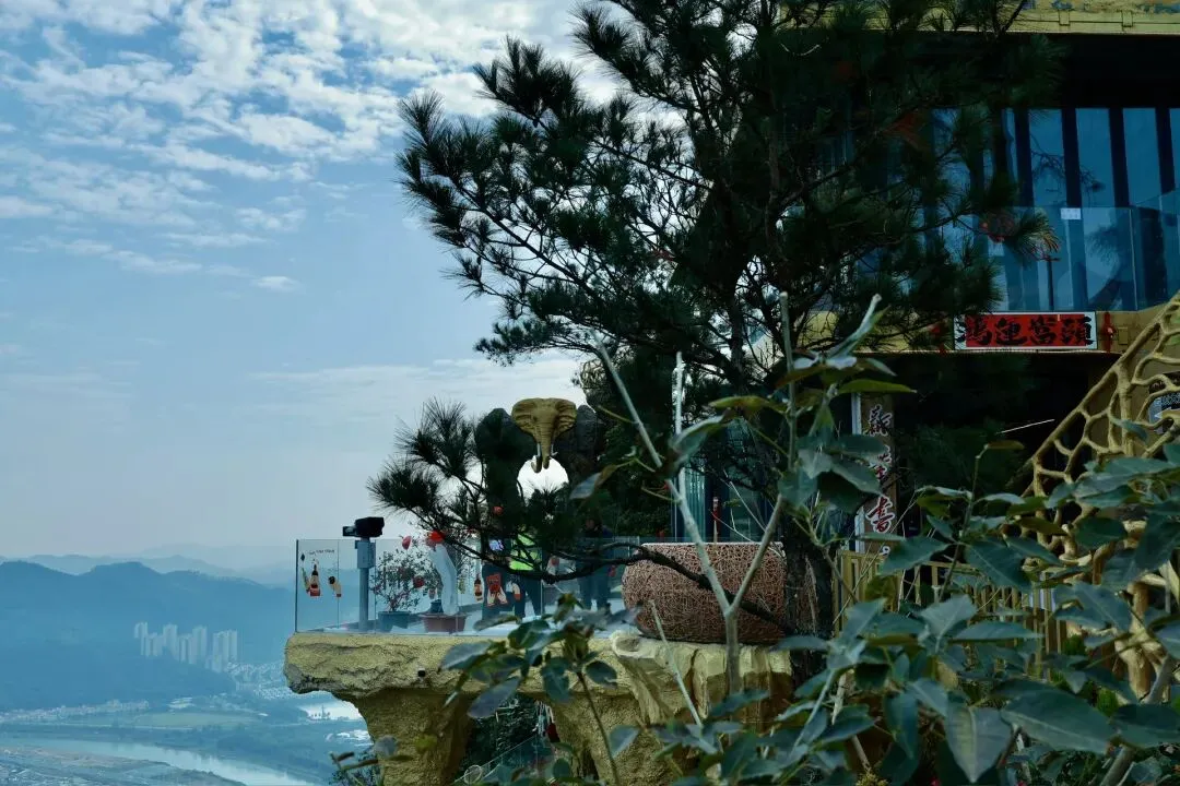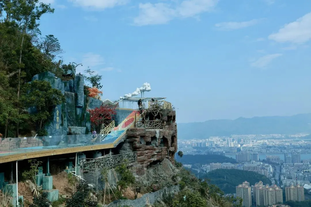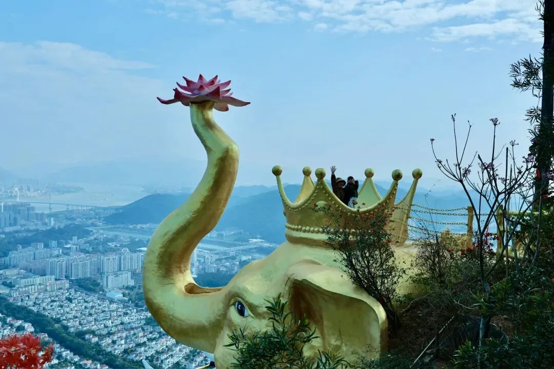 此次打卡选择了坐观光车登顶的路线,丛林咖啡对面的腾龙道便是最佳路径。金黄梯级蜿蜒向上,全程被林荫遮挡,无需担心日晒,15分钟的攀登节奏刚刚好,伴着山间的清风与虫鸣,一步步靠近山顶的美好。行至吉象亭,这座谐音“吉祥”的双层亭子是山顶的核心,登上二楼,视野豁然开朗,远处的城市楼宇、蜿蜒的西江流水与眼前的葱茏山林相映成趣,真正体验到“一览众山小”的畅快。