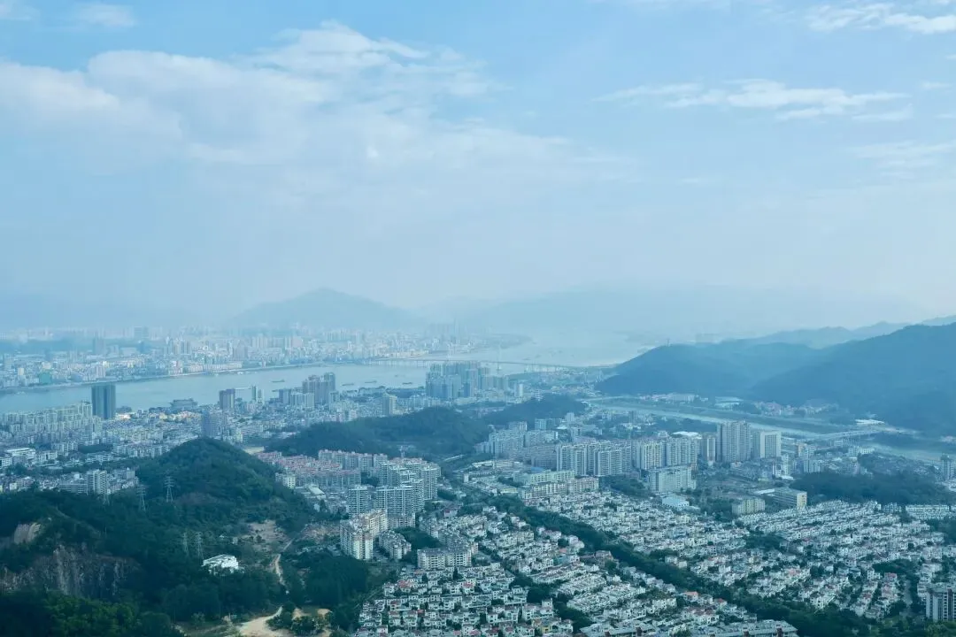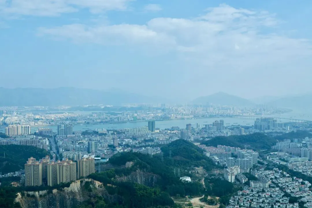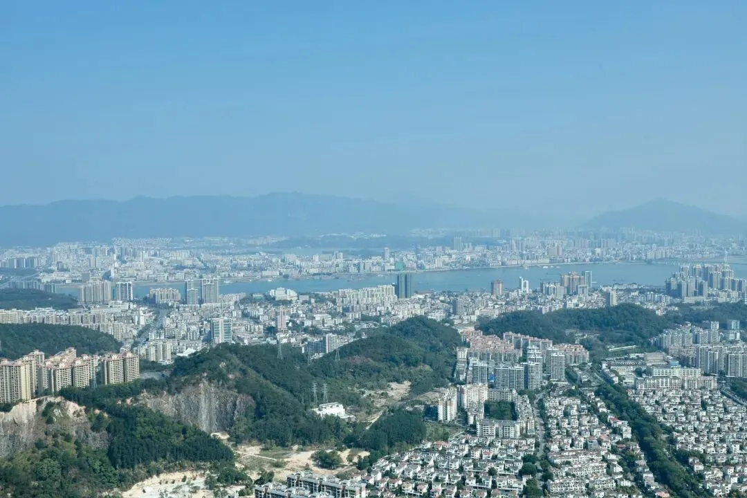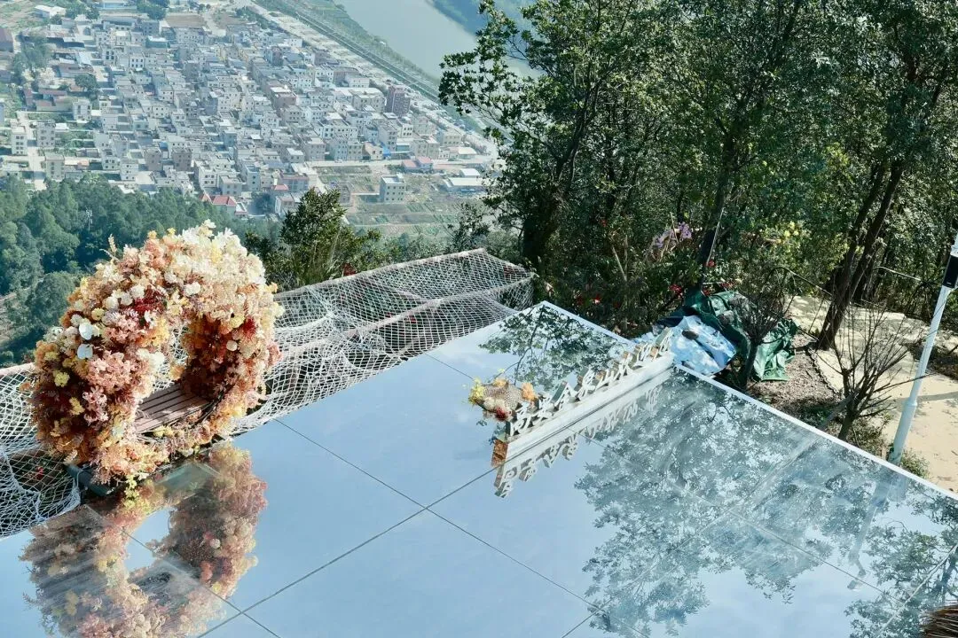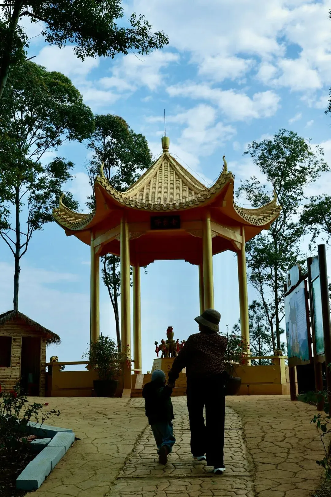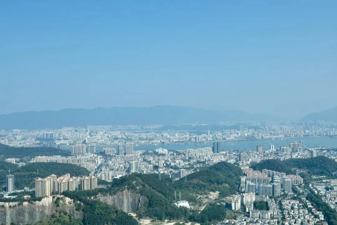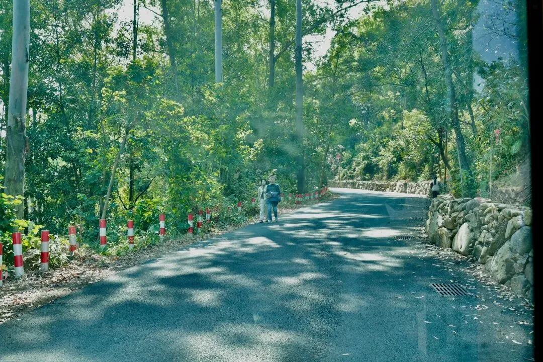 此次打卡选择了坐观光车登顶的路线,丛林咖啡对面的腾龙道便是最佳路径。金黄梯级蜿蜒向上,全程被林荫遮挡,无需担心日晒,15分钟的攀登节奏刚刚好,伴着山间的清风与虫鸣,一步步靠近山顶的美好。行至吉象亭,这座谐音“吉祥”的双层亭子是山顶的核心,登上二楼,视野豁然开朗,远处的城市楼宇、蜿蜒的西江流水与眼前的葱茏山林相映成趣,真正体验到“一览众山小”的畅快。