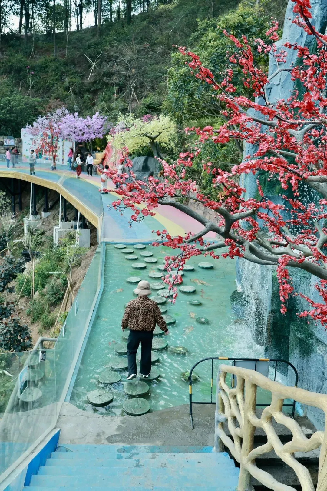 10分钟后抵达半山腰的丛林咖啡秘境,彩虹步梯是这里的打卡重头戏,斑斓的阶梯如琴键般铺展在绿意间,走在上面仿佛为山林美景弹奏乐章。咖啡木屋藏于林间,原木搭建的空间与自然相融,点一杯独具地方特色的“高桂啡”,坐在观景平台的吊床或藤椅上,凭栏远眺高要的田园风光,鸟鸣作伴、咖啡醇香,松弛感拉满。